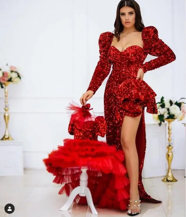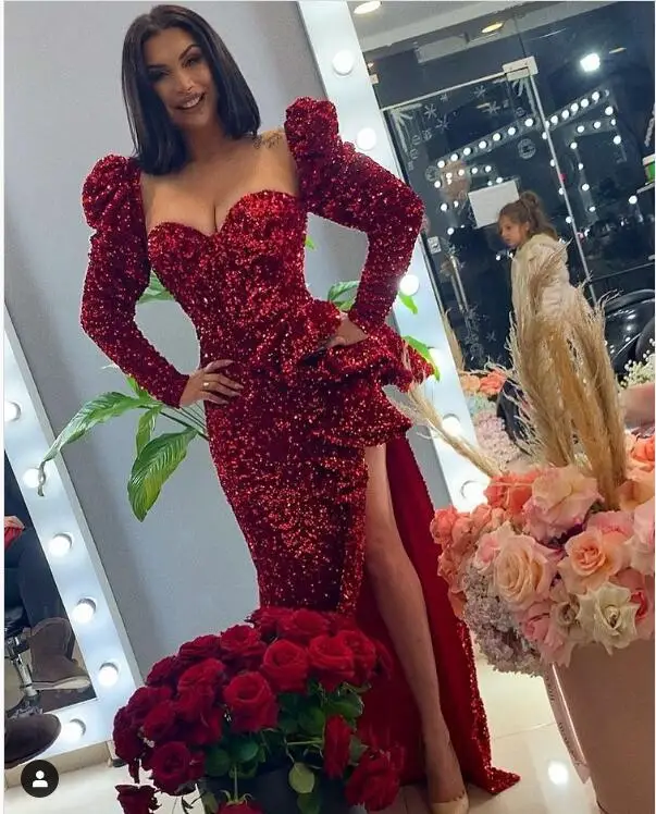 Пикантные блестящие блестками красные Разделение длинные платья для выпускного вечера; Платье с длинными рукавами, с рюшами, для выпускного бала, платья для женщин гость Свадебная вечеринка платья
