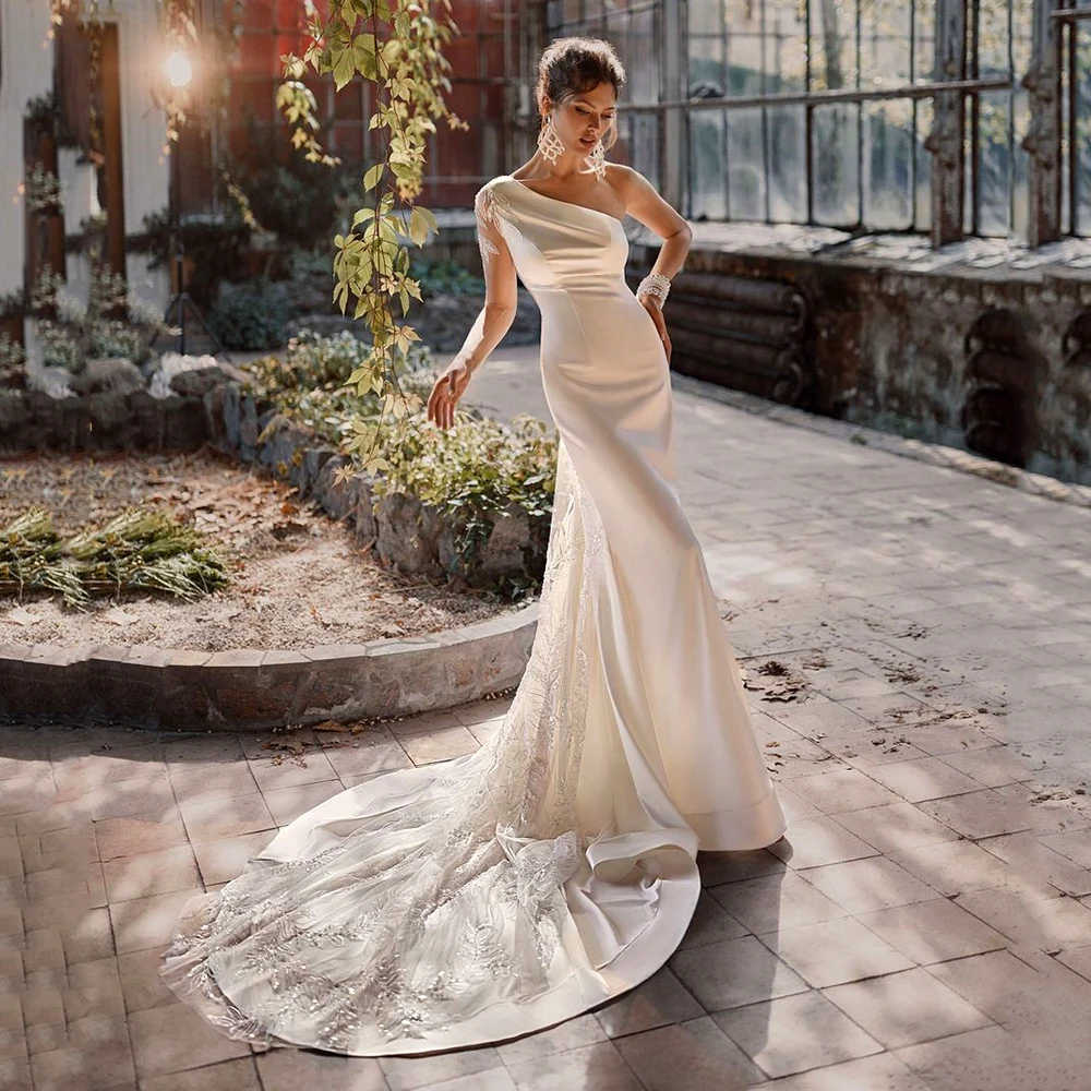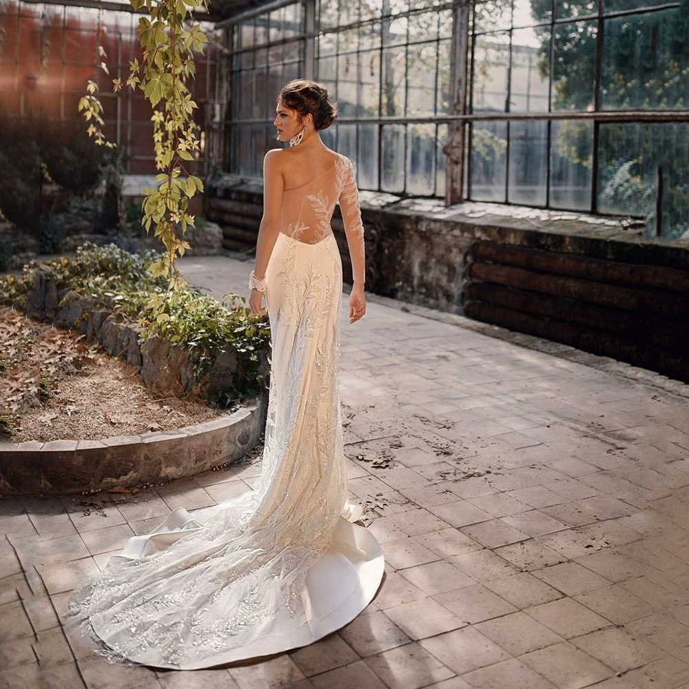 UZN Элегантное свадебное платье Русалочки на одно плечо с длинными рукавами, кружевное и атласное свадебное платье цвета слоновой кости, платье невесты с открытой спиной в Дубае на заказ