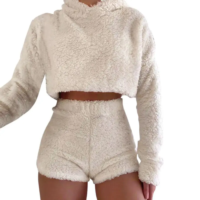 Женский флисовый комплект из 2 предметов, укороченный топ с капюшоном и шорты