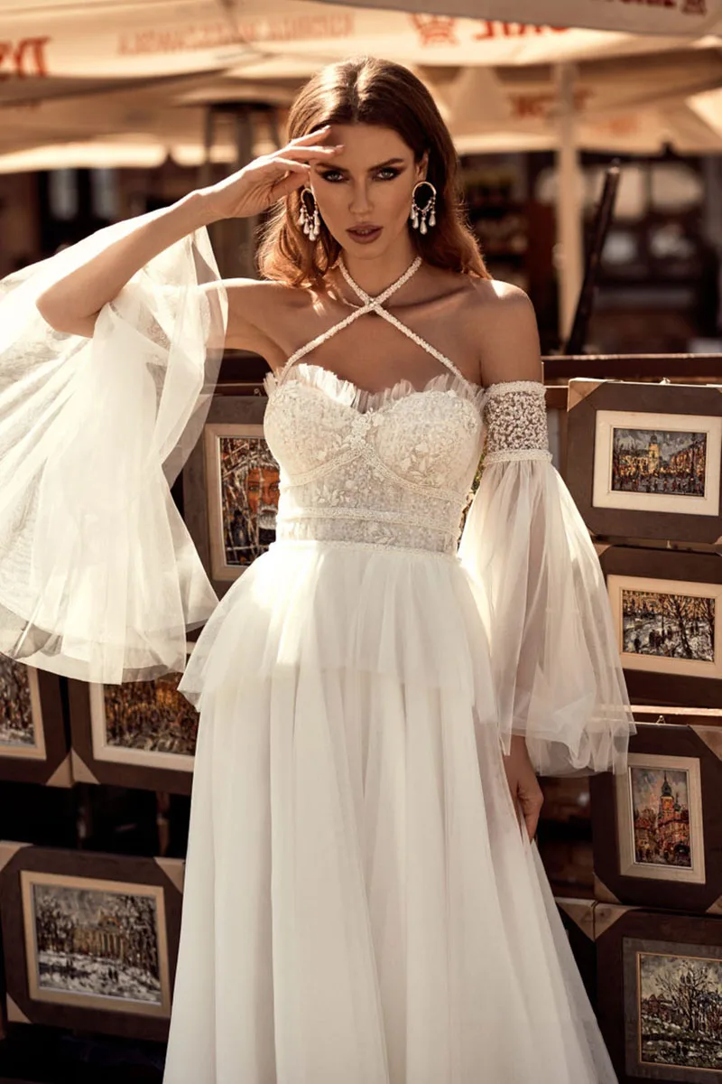Платье свадебное со съемными рукавами-фонариками и V-образным вырезом