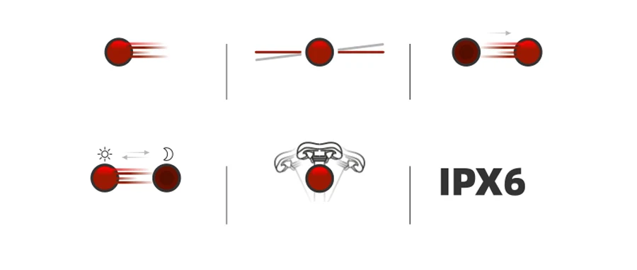 Модель: Super One-Алюминиевый корпус-Автоматическое включение/выключение в зависимости от интенсивности и движения светильник.-Автоматическое переключение в режим сна для экономии энергии.-Функция обнаружения тормозов-Шарик лампы: COB светодиодный * 20-6 режимов освещения.-Максимальная продолжительность работы 33 часа.-Перезаряжаемый литий-ионный аккумулятор 420 мАч.-Зарядка через USB.-Светильник весовой конструкции (40 г).-Водонепроницаемость IPx6.