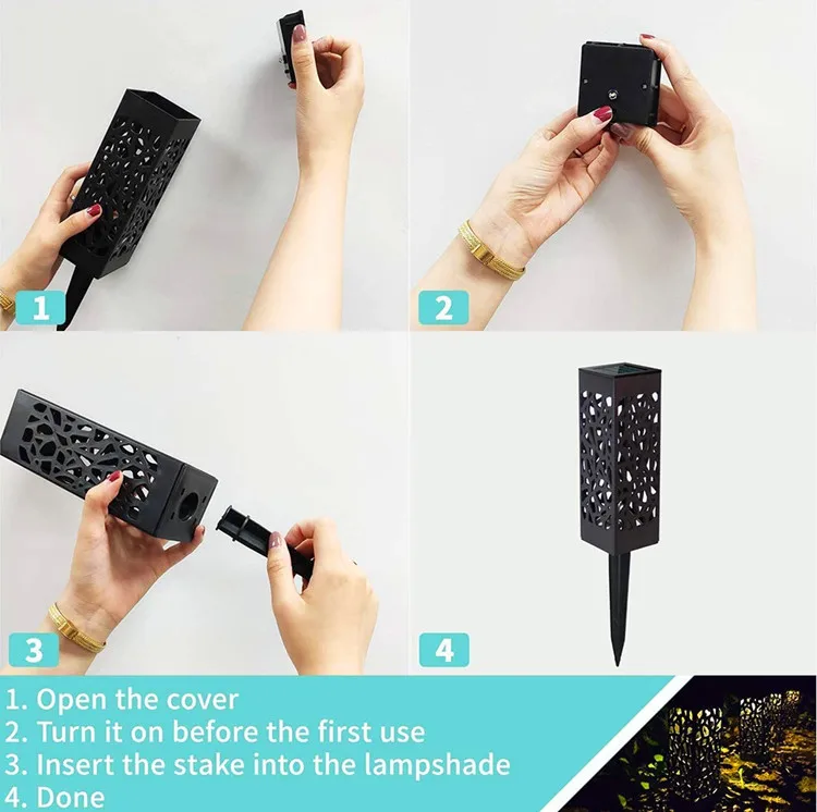 4. Простота установки: никаких инструментов или проводов не требуется. Выньте кол из корпуса и установите его в нижнюю часть корпуса КОРПУСА корпуса и включите переключатель под панелью солнечных батарей, затем вставьте светильник в мягкую землю. Переключатель просто должен включаться в первый раз, светильник автоматически включается ночью и выключается на рассвете