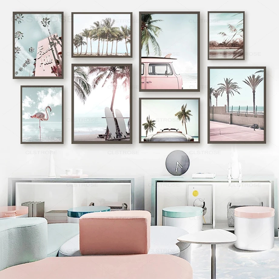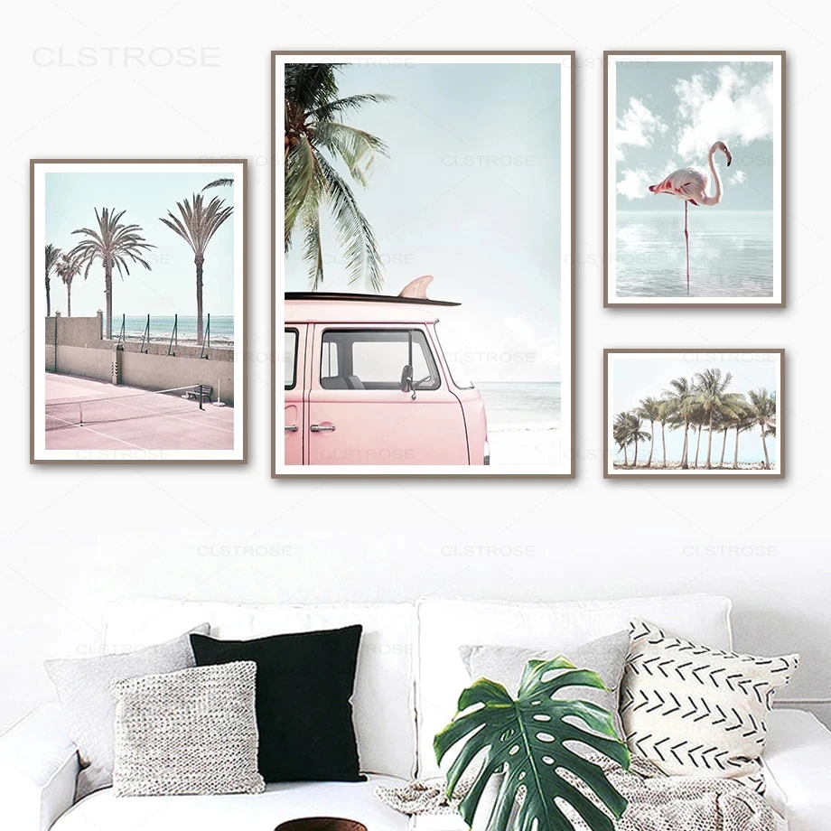 Постер Noridc с морским пейзажем, Розовый фламинго, автомобиль, зеленая пальма, море, пляж, Картина на холсте, домашний декор, настенные картины для гостиной