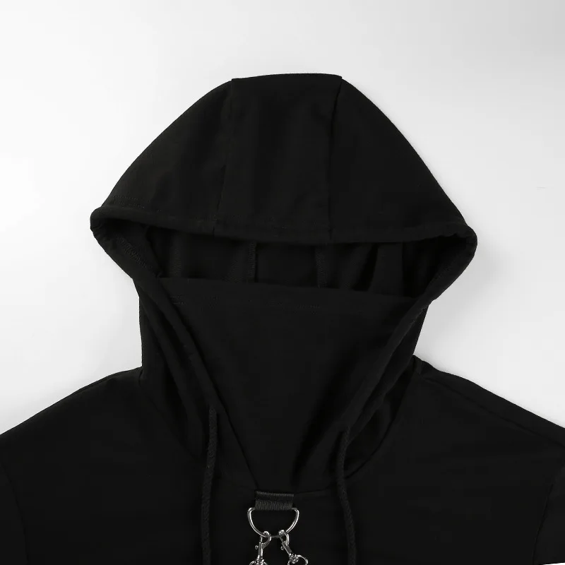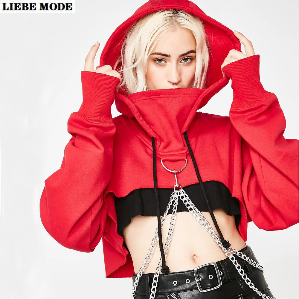 Куртка женская короткая с капюшоном, готический кроп-топ в стиле Харадзюку, свободная толстовка с длинным рукавом и цепочками, черный красный цвета