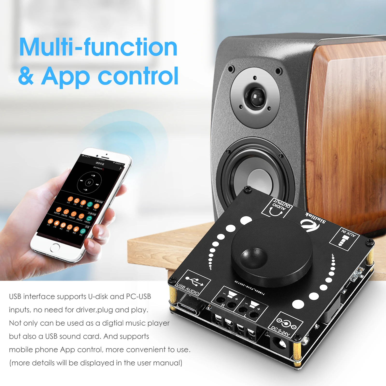 [Многофункциональное управление и Управление приложениями]: usb-интерфейс поддерживает входы u-диска и PC-USB, нет необходимости в драйвере, подключи и работай. Может использоваться не только как цифровой музыкальный проигрыватель, но и звуковая карта USB. И поддерживает мобильный телефон, более удобный в использовании. (более подробная информация будет отображаться в руководстве пользователя)