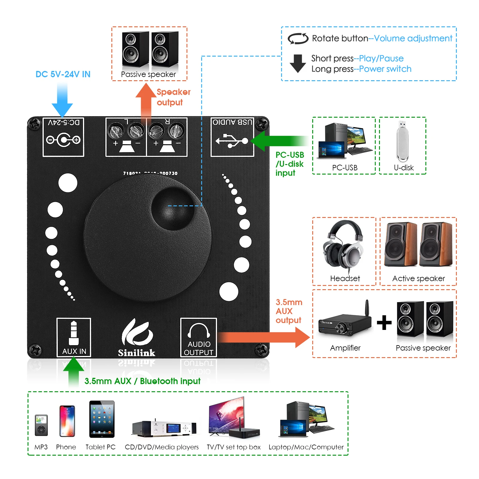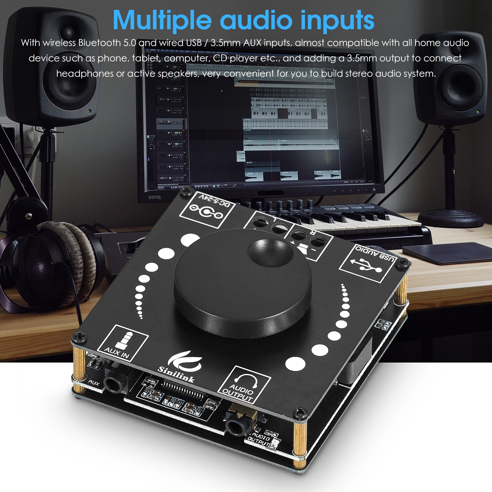 [Несколько аудиовхода]: с беспроводным Bluetooth 5,0 и проводной USB/3,5 мм входа AUX, почти совместимы со всеми домашний аудио устройств, таких как телефон, планшет, компьютер, проигрыватель компакт-дисков и т. д., И добавление 3,5 мм выход для подключения наушников или активные колонки, очень удобно для вас, чтобы построить стерео аудио системы.