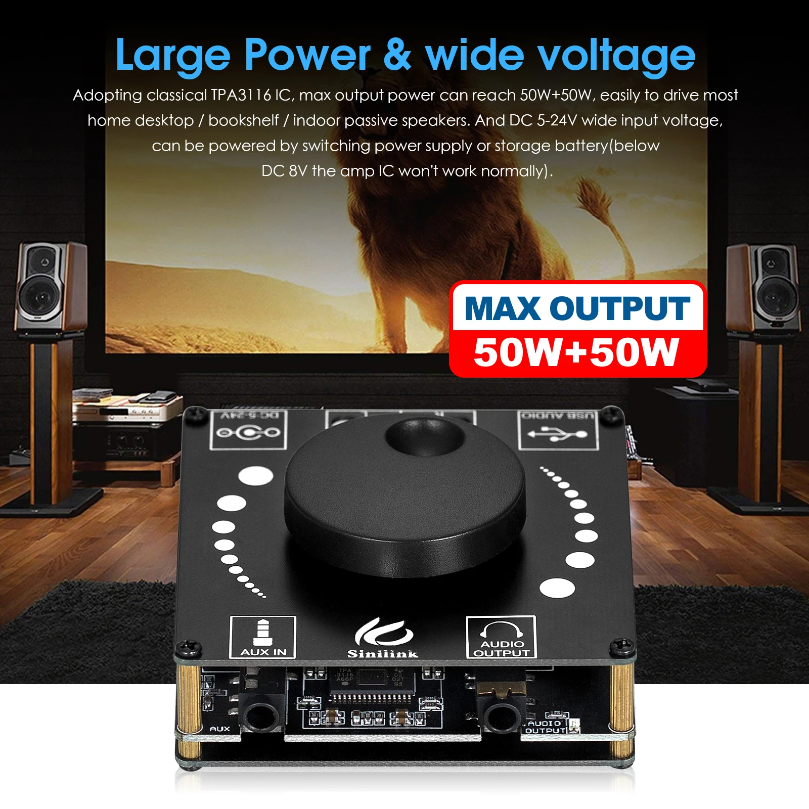[Большая мощность и широкое напряжение]: принятие классического TPA3116 IC, максимальная выходная мощность может достигать 50 Вт + 50 Вт, легко управлять большинством домашних настольных/книжных полок/внутренних пассивных динамиков. И 5-24 В постоянного тока широкое входное напряжение, может питаться от переключателя питания или аккумулятора (ниже 8 В постоянного тока Ампер IC не будет работать нормально).