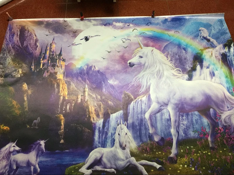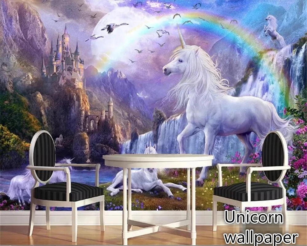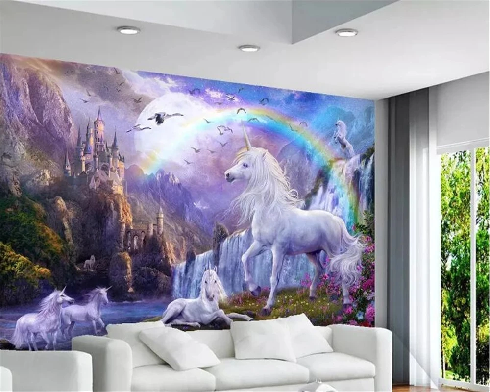 Самоклеящиеся обои 3D для домашнего декора, картина маслом в спальню, с изображением голубого неба, радуги, единорога, пейзажа, для детской комнаты