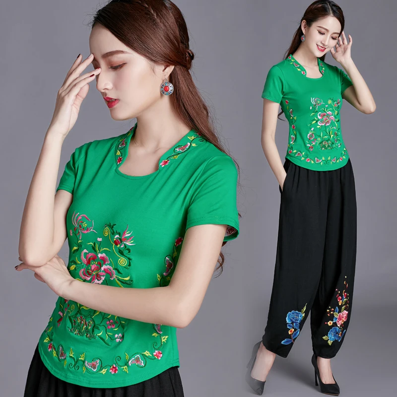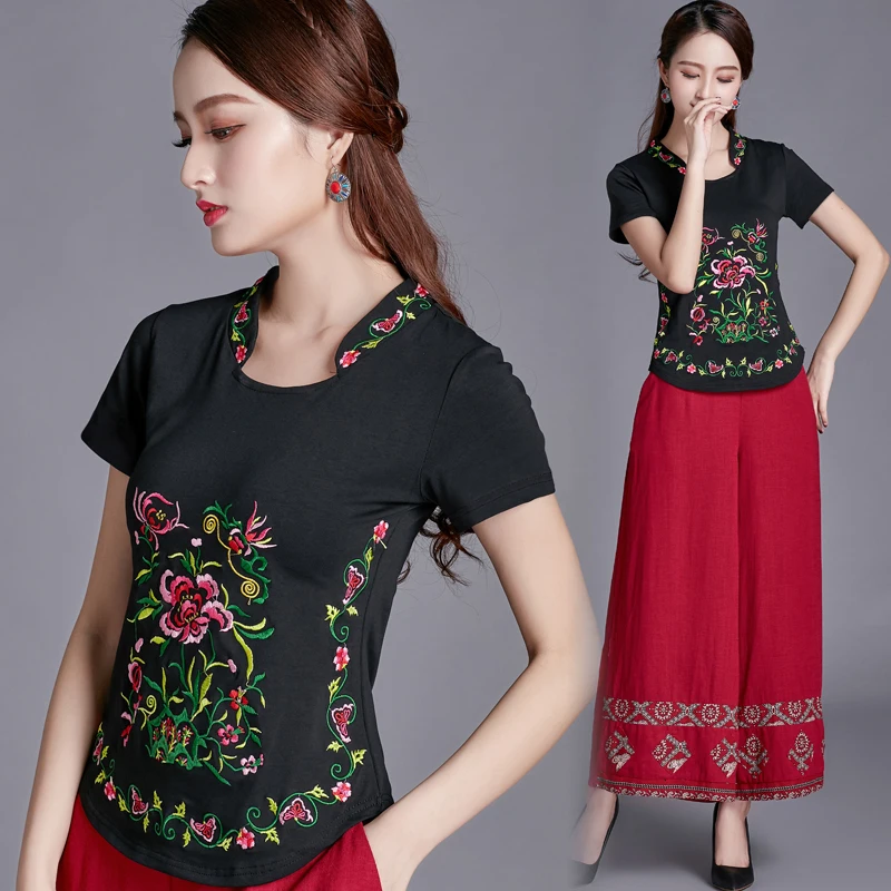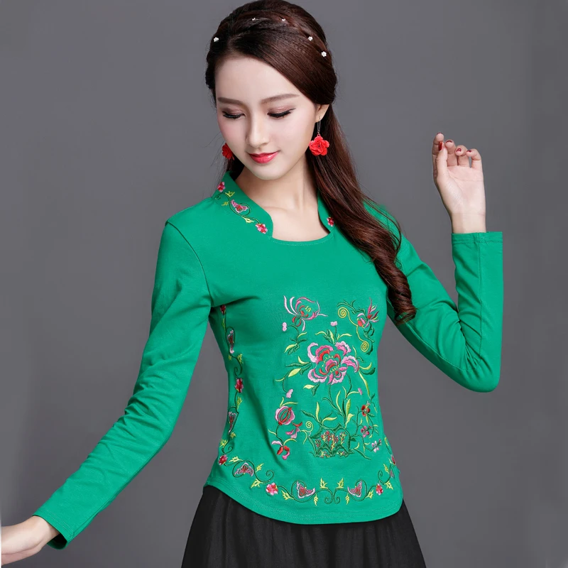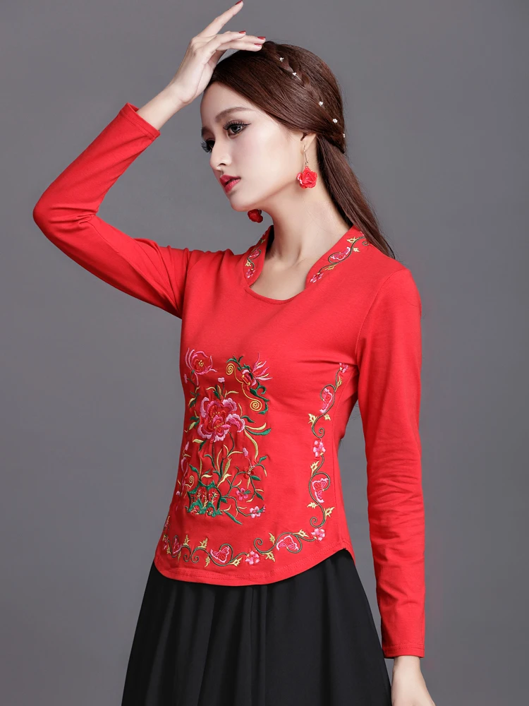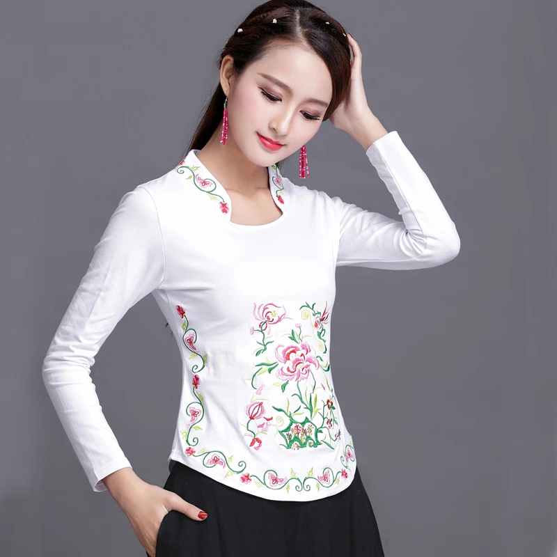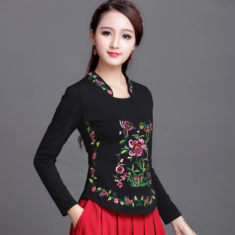 Топ, футболка, рубашка, женская одежда, женские блузы с застежкой; Сезон осень футболка для женщин с вышивкой Весенняя футболка с рисунком женские Винтажные ботинки в китайском стиле Стиль цветочный Инди фолк размера плюс 6XL