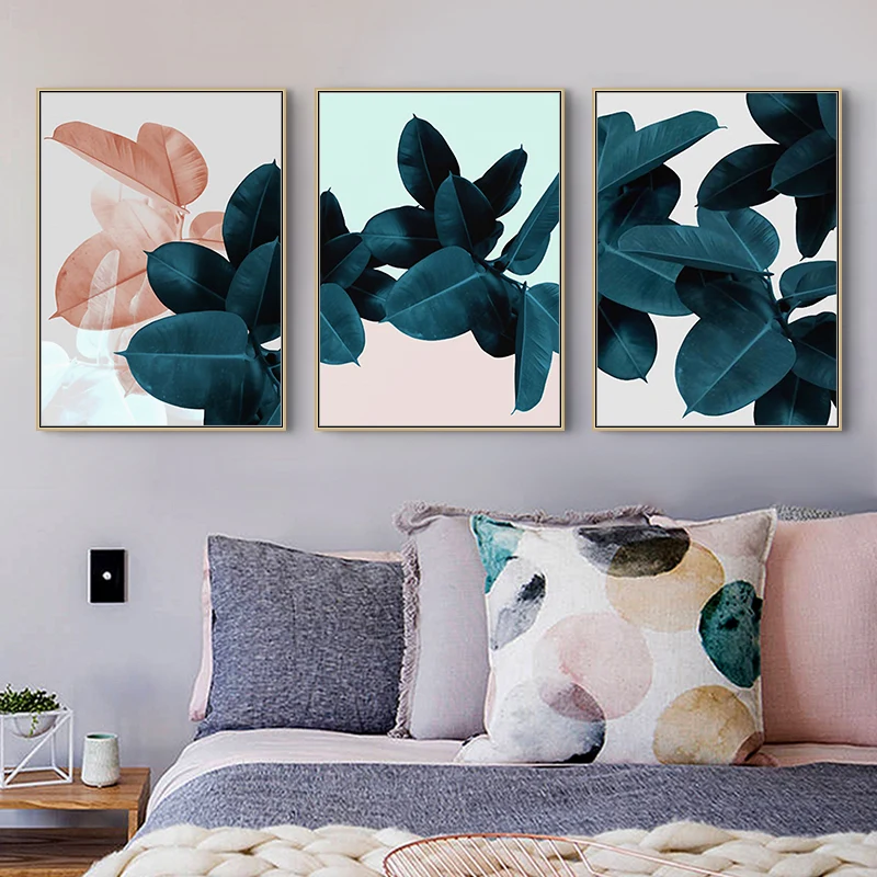 Настенный постер с розовыми, темно-зелеными тропическими листьями, рисунок на холсте в скандинавском стиле, декор для гостиной
