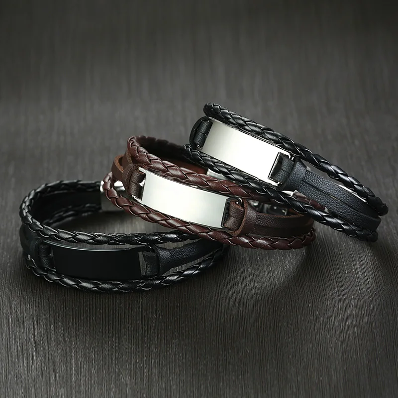 Мужской плетеный кожаный браслет с металлической идентификационной биркой, с изогнутой пластиной, браслет с гравировкой