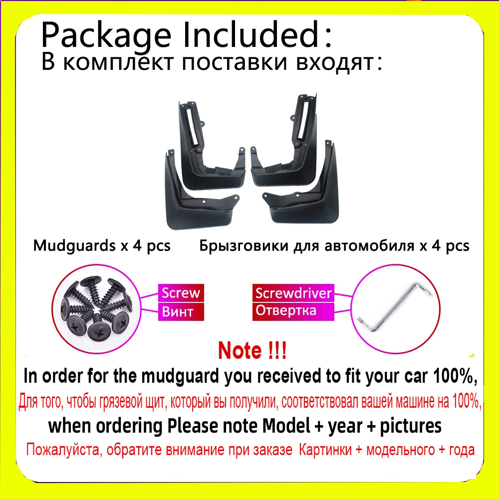 Эти износостойкие грязевые предохранители легко сочетаются с автомобилями и минимизируют риск грязи, Дорожный мусор и каменные чипы летят с передних и задних шин. Обеспечьте дополнительную защиту, улучшая спортивный внешний вид вашего автомобиля инструкции по установке: 1. Автомобиль в нижней части оригинальных винты для автомобилей с гаечным ключом для винта вниз 2. Возьмите Брызговики, хорошее расположение, винты installed3. Винты установлены в соответствующем отверстии на брызговиках.
