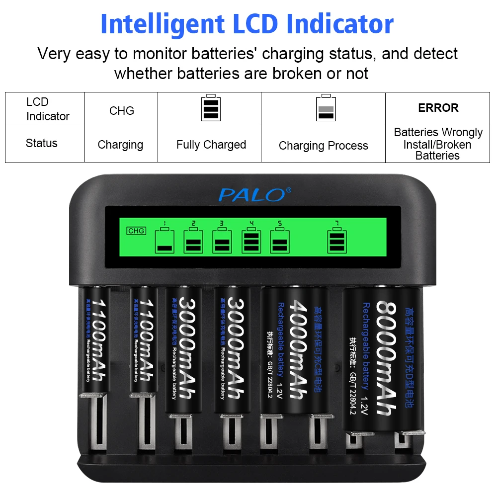 Зарядное устройство PALO с 8 слотами и ЖК-дисплеем, интеллектуально...