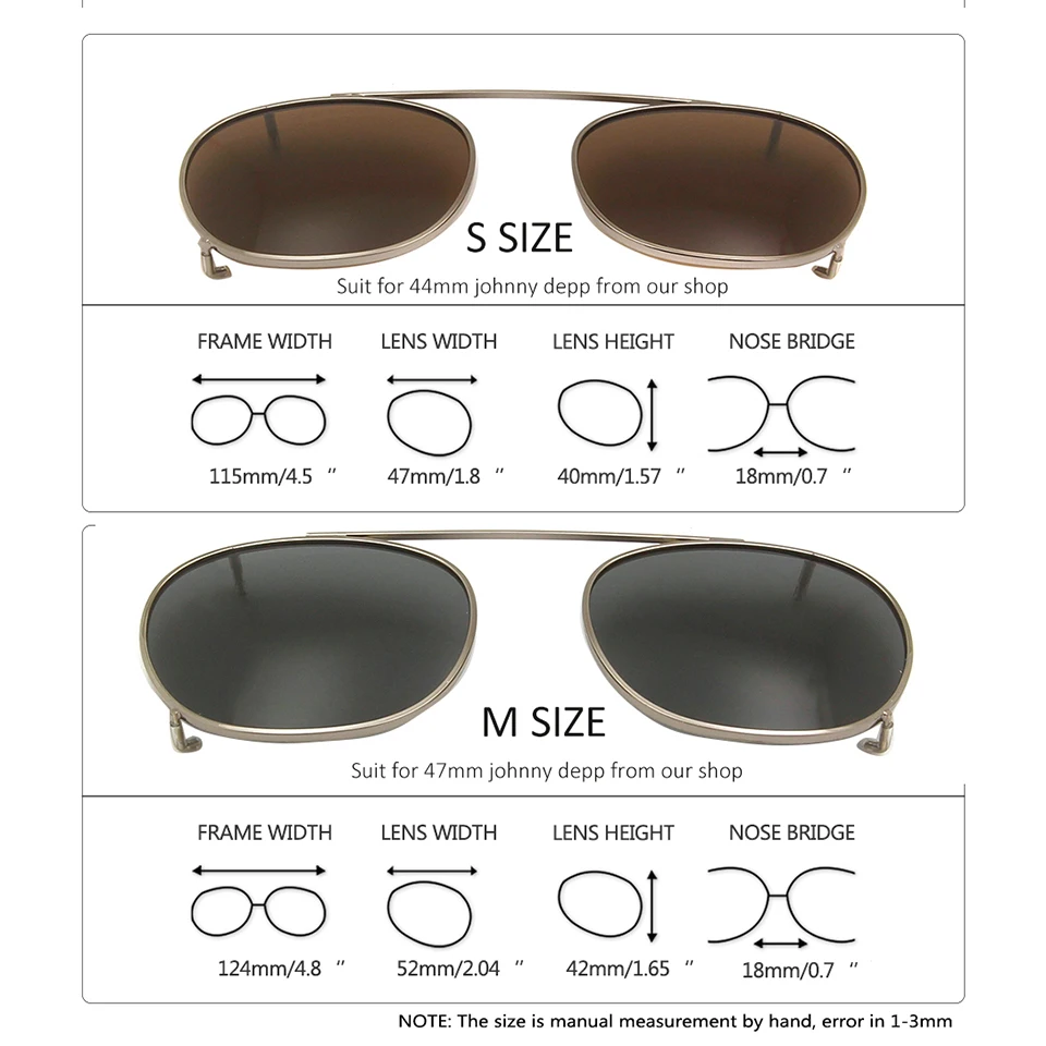 Советы: Этот зажим специально разработан только для нашей собственной оптической оправы в стиле ацетата в стиле johnny depp, если вы хотите разместить его на другой оправе, пожалуйста, внимательно проверьте размер зажима.