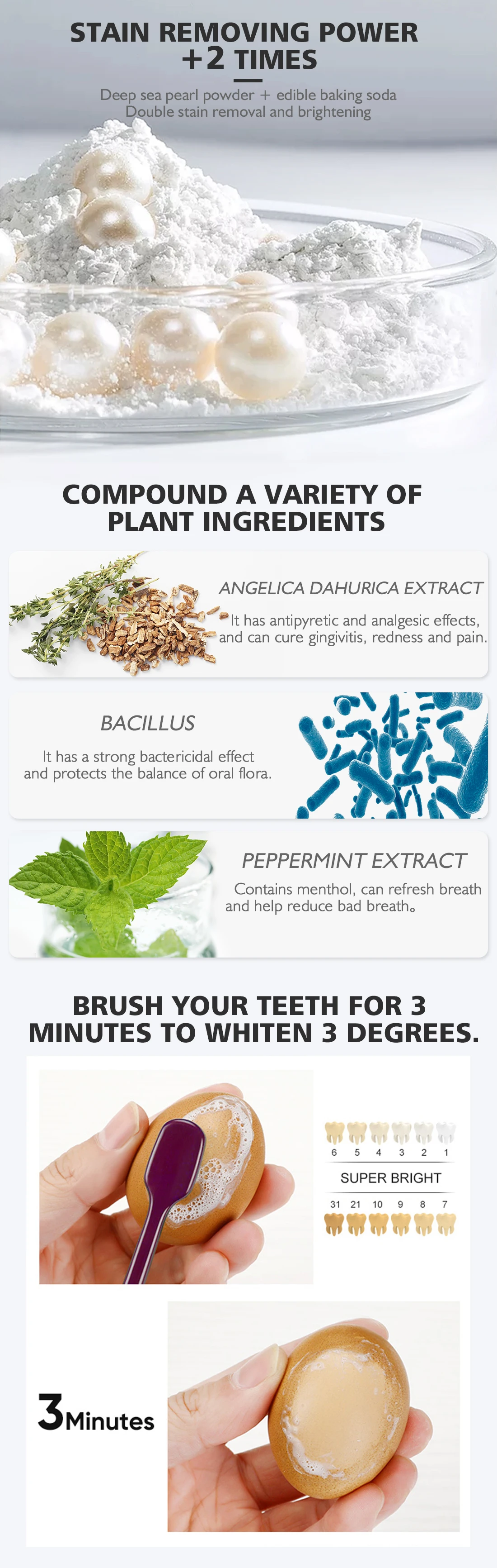 Отбелить зубы и удалить пятна. Пудра гладкая и обладает нежным ароматом, который помогает уменьшить запах полости рта и пятна на поверхности зубов, разложить осажденные пигменты и сохранить зубы яркими и белыми. Он мягкий и не раздражает, ухаживает за деснами и восстанавливает здоровую полость рта.