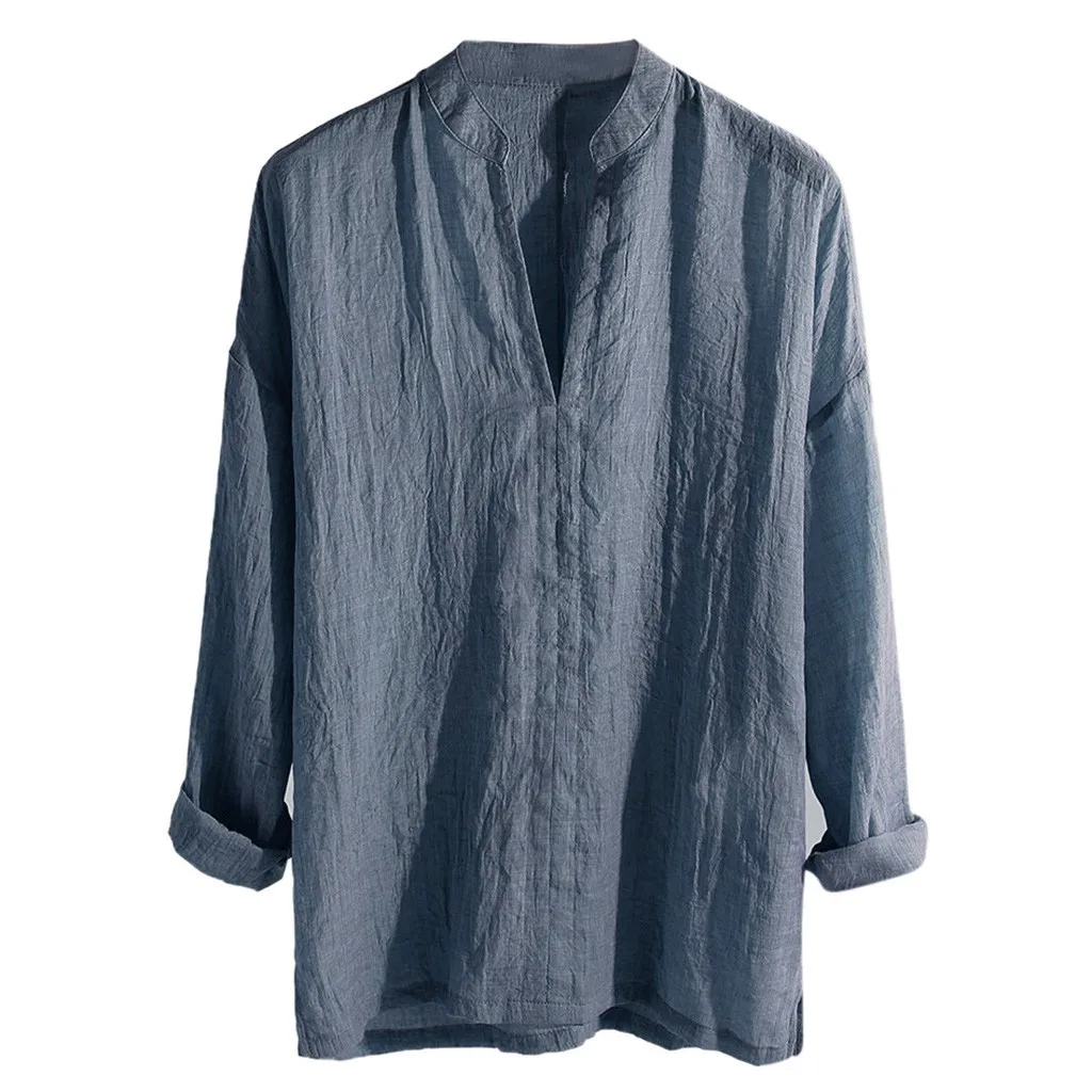 Рубашка мужская из хлопка и льна, с длинным рукавом и V-образным вы...
