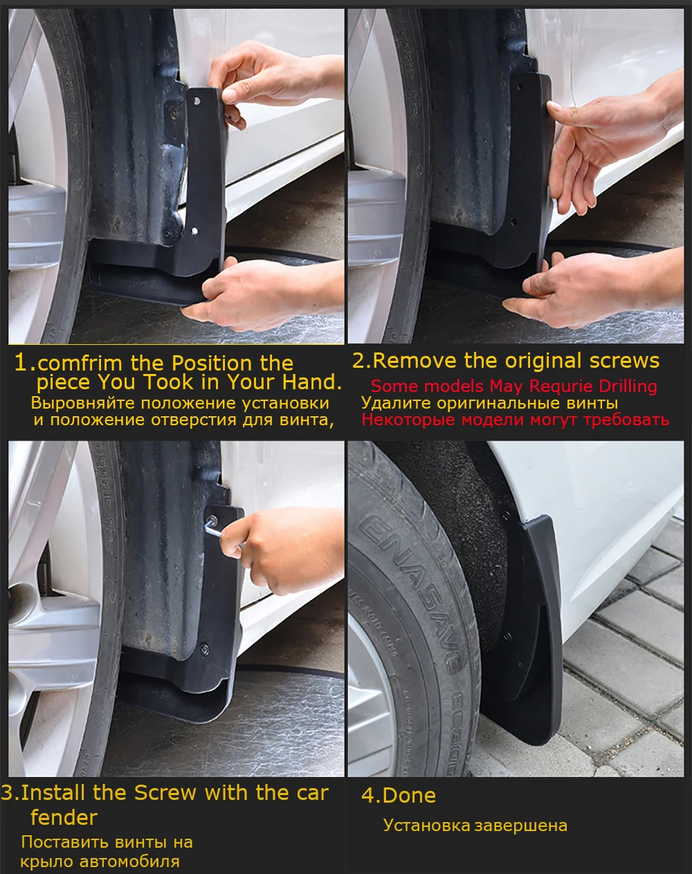 Эти износостойкие грязевые предохранители легко сочетаются с автомобилями и минимизируют риск грязи, Дорожный мусор и каменные чипы летят с передних и задних шин. Обеспечьте дополнительную защиту, улучшая спортивный внешний вид вашего автомобиля инструкции по установке: 1. Автомобиль в нижней части оригинальных винты для автомобилей с гаечным ключом для винта вниз 2. Возьмите Брызговики, хорошее расположение, винты installed3. Винты установлены в соответствующем отверстии на брызговиках.