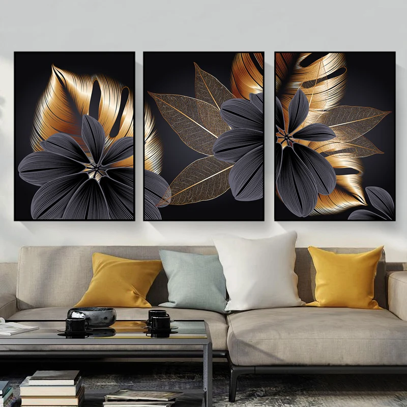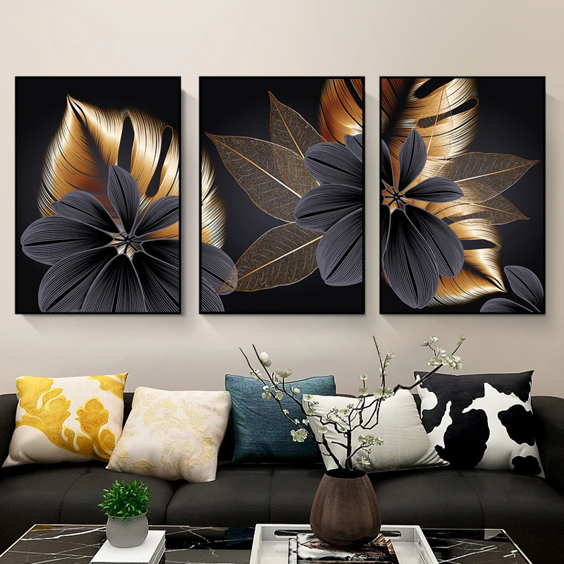 Плакат на холсте с изображением черных и золотых растений, Современ...