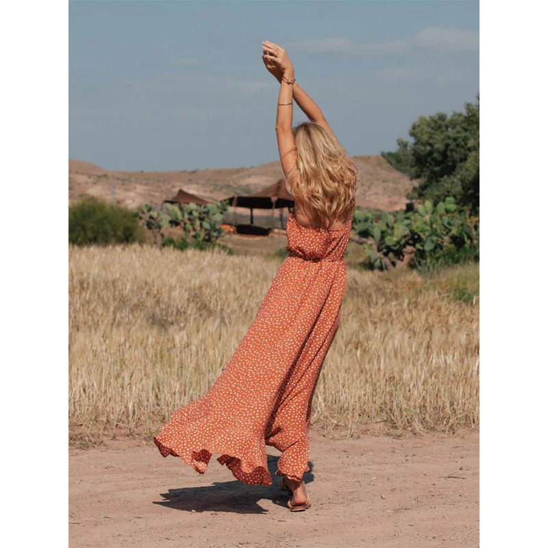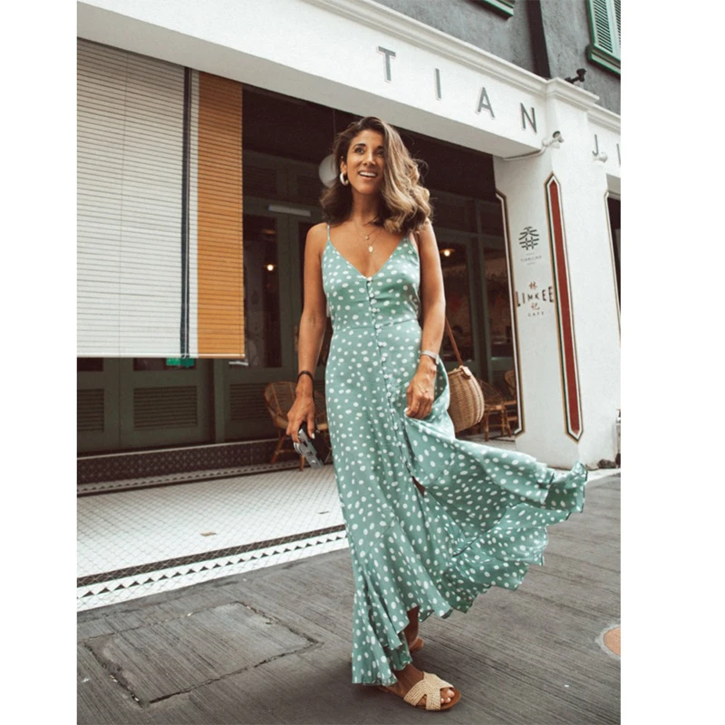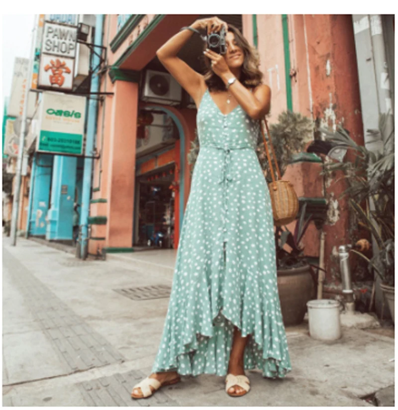 Платье женское макси в стиле бохо, длинный пикантный пляжный сарафан с оборками, в горошек, с V-образным вырезом, одежда для девушек, на лето