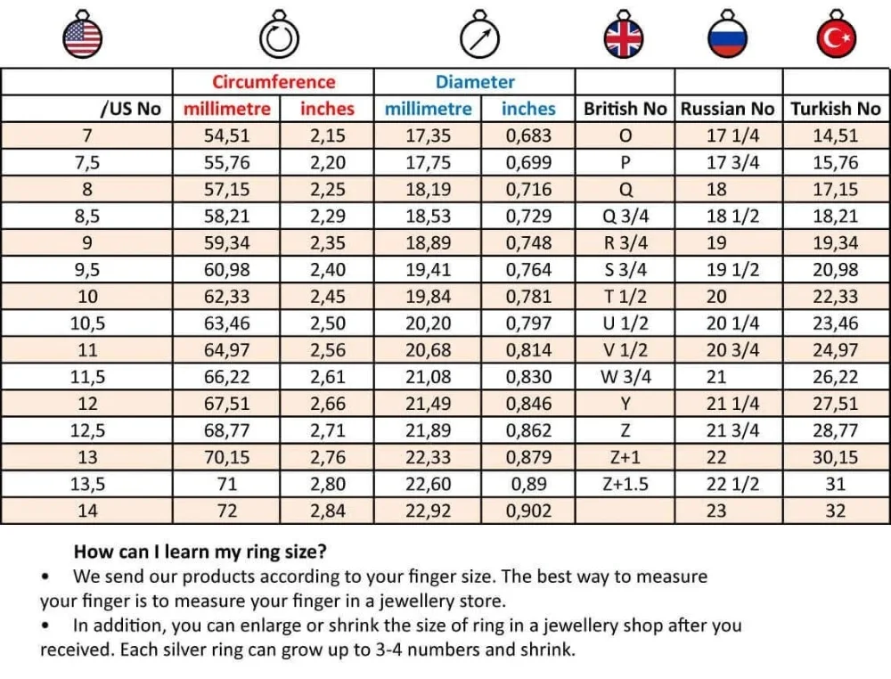• Мы отправляем нашу продукцию в соответствии с размером вашего пальца. Лучший способ измерить палец-это измерить палец в ювелирном магазине.• Кроме того, вы можете увеличить или уменьшить размер кольца в ювелирном магазине после получения. Каждое серебряное кольцо может вырасти до 3-4 цифр и уменьшаться.• Вы можете продлить срок службы серебряного кольца, избегая мыла, дезодоранта, пота и воды.