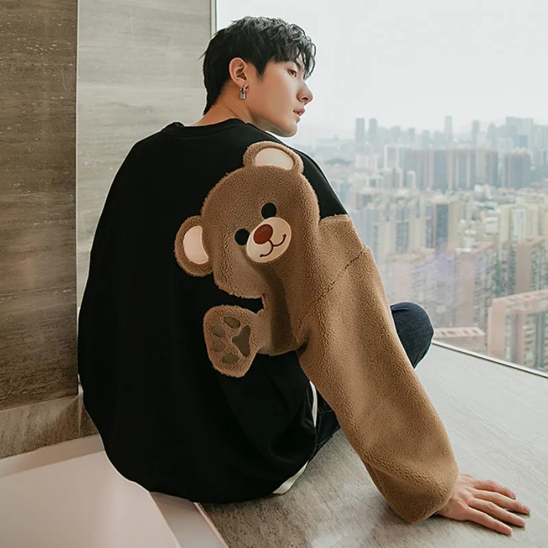 Мужской свитшот с плюшевым мишкой, толстый черный пуловер с круглым вырезом и длинными рукавами, свитшот с вышивкой из ягненка, весна-осень 2021