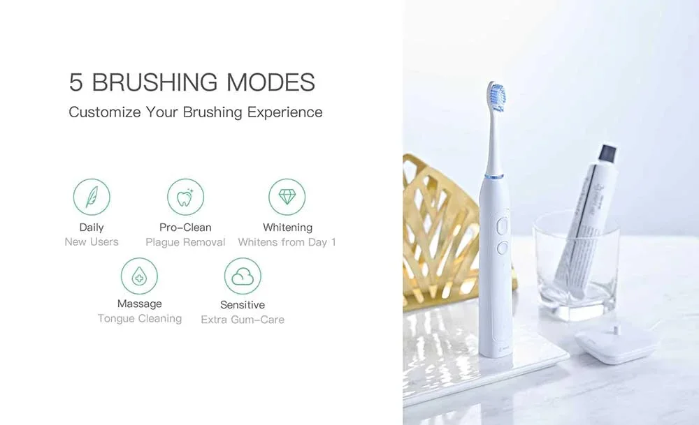 Это имеет 5 режимов чистки зубов. Это ежедневные (новые пользователи), прочистку (удаление чумы), отбеливание (отбеливает от дня 1), массаж (Чистка языка) и чувствительный (уход за дополнительной десной). Эти режимы кисти делают зубы прочными и блестящими. Каждый режим чистки дает вам различную очистку зубов, а также сохраняет чистоту рта.