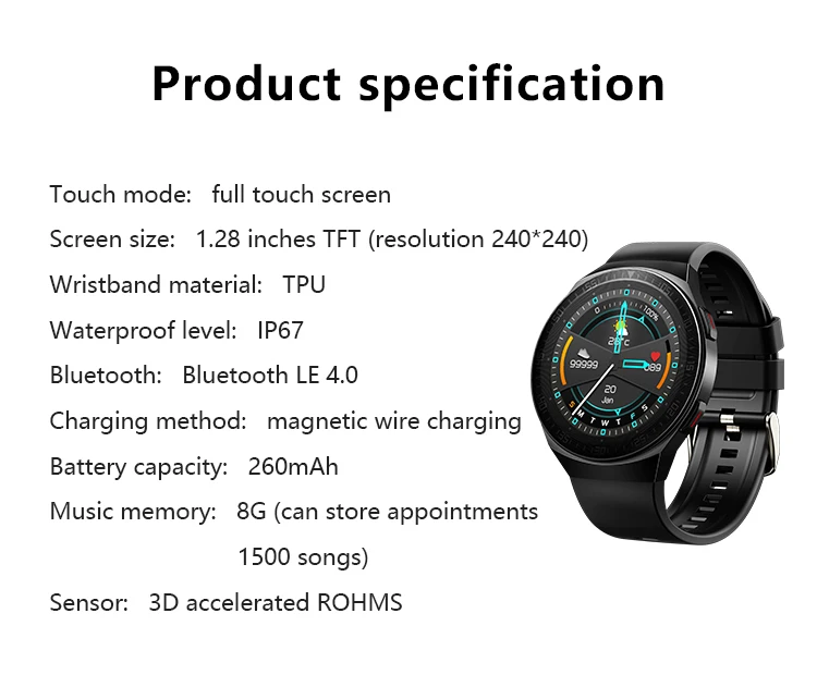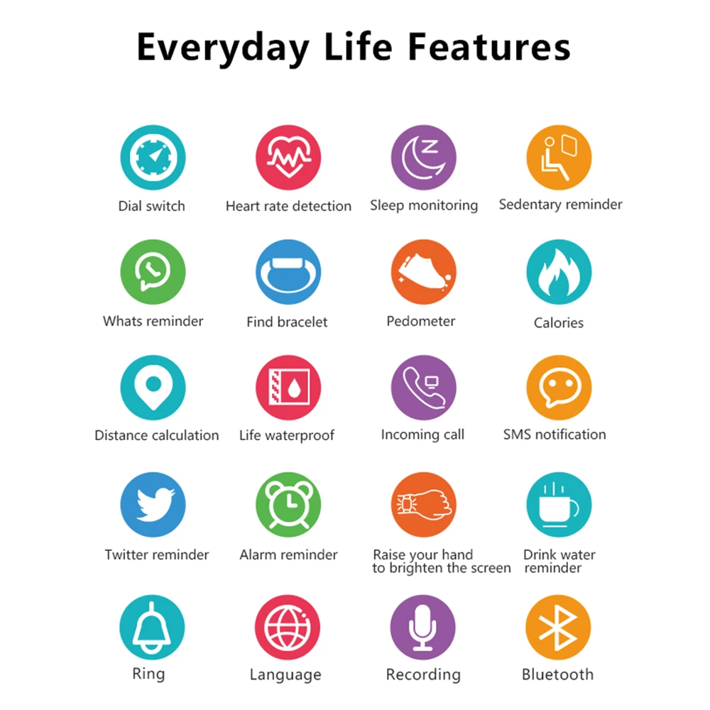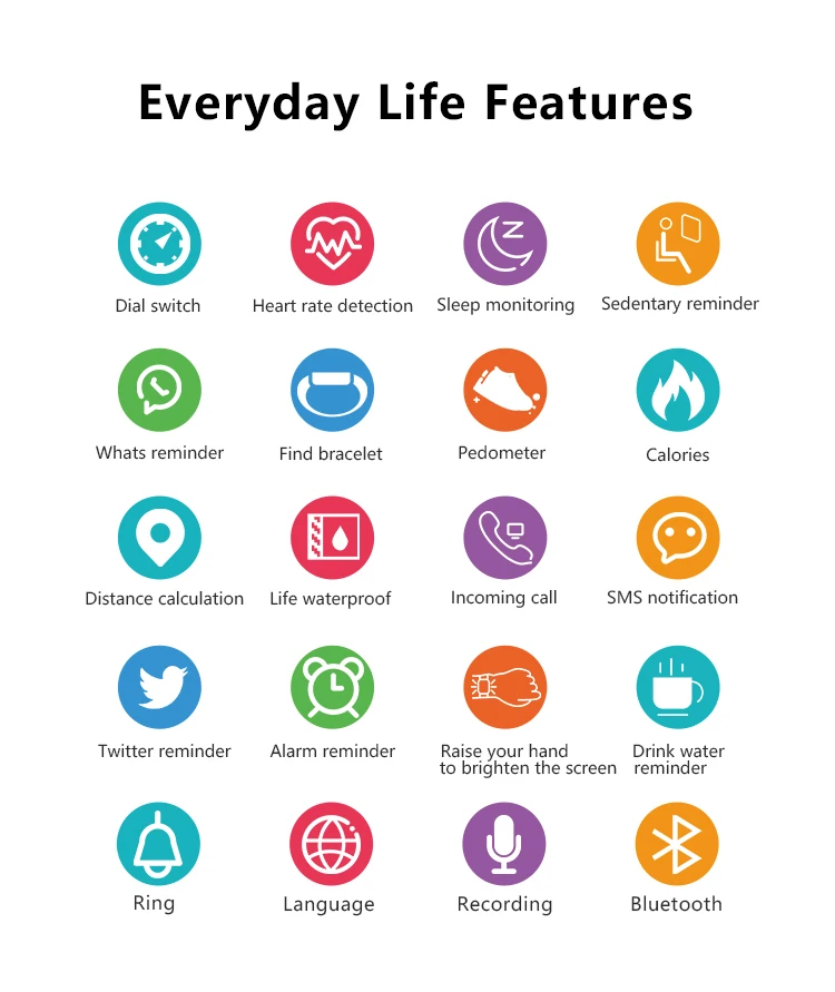 -Музыкальная Функция: может воспроизводить мобильный телефон музыку и местную музыку, может быть подключен к TWS/аудио и т. Д. -Вызов по Bluetooth -Запись -MT3:8G (можно хранить 3000 песен),MT1/2:128M (магазин 30 песен о) -Мониторинг здоровья: подсчет шагов, мониторинг сна, пульса, артериального давления, кислорода в крови, напоминание о малоподвижности, напоминание о питье -Шаг упражнения: шаги упражнений, запись пробега упражнений, расход калибра, несколько режимов упражнений. Отслеживание движения (отображается мобильным приложением) -24-часовой мониторинг сердечного ритма -BLE соединение использует 7-10 дней, двойное время использования bluetooth 3-5 дней, непрерывный вызов или воспроизведение музыки 5 часов -Примечание: Срок службы батареи может варьироваться в зависимости от использования, настроек и многих других факторов, Это означает, что фактические результаты могут отличаться. -Отключить будильник, удаленная камера, управление музыкой, мелодии звонка, запись и т. Д.