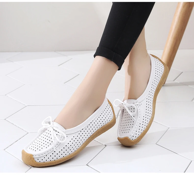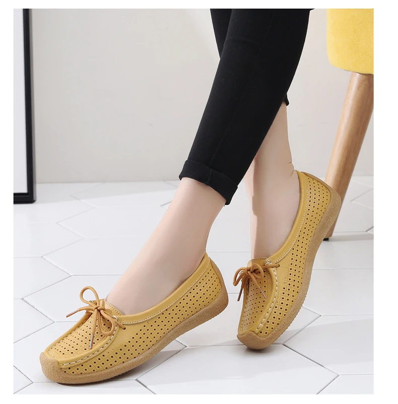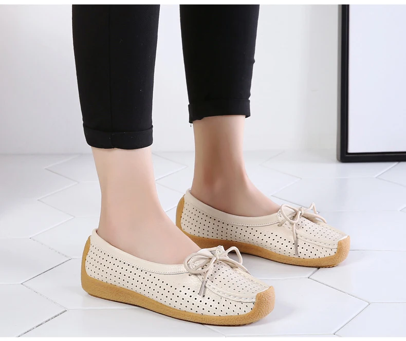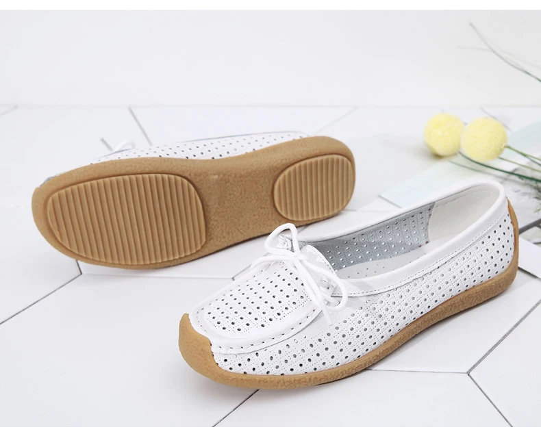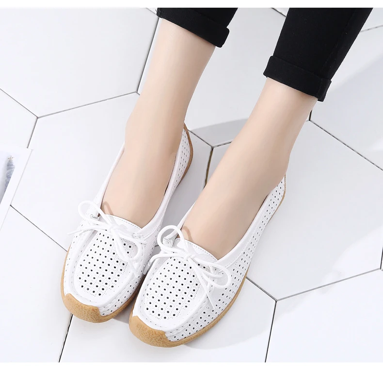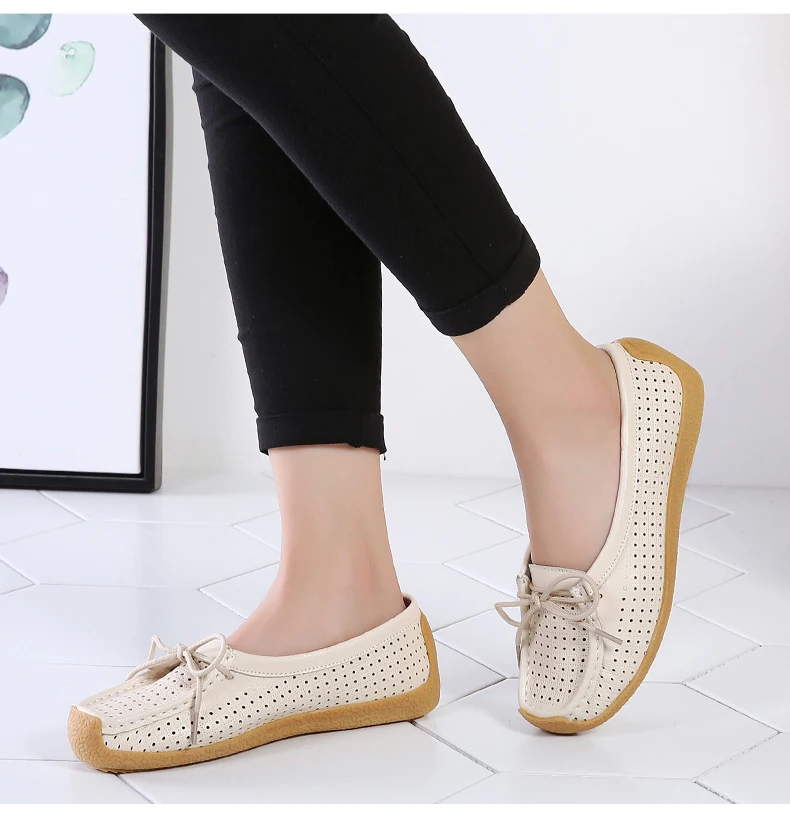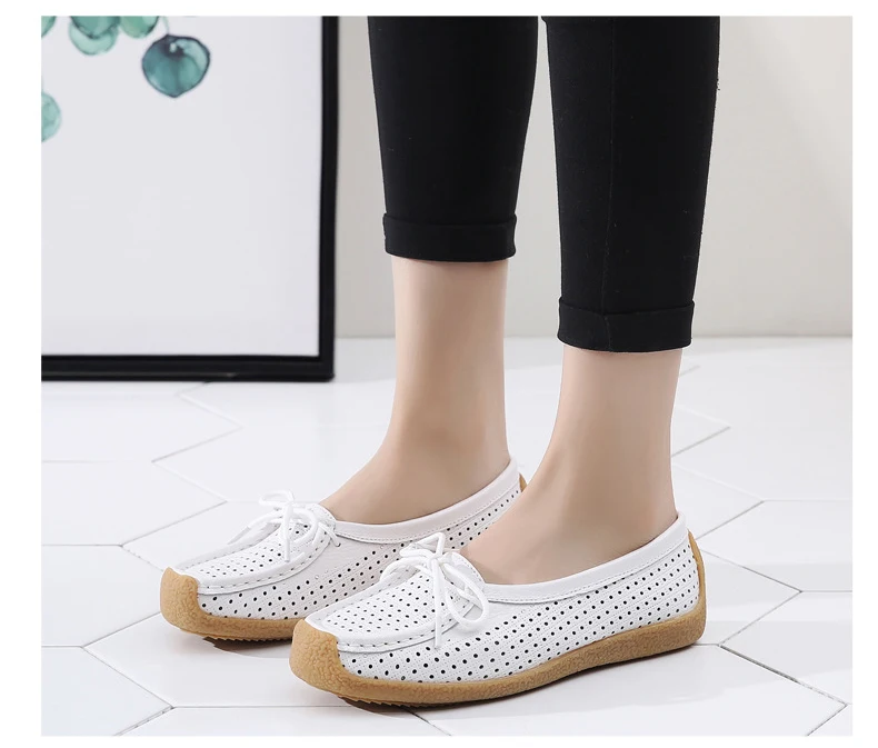 Туфли женские с вырезами, натуральная кожа, плоская подошва, лоферы, на шнуровке, Мокасины, модная летняя обувь