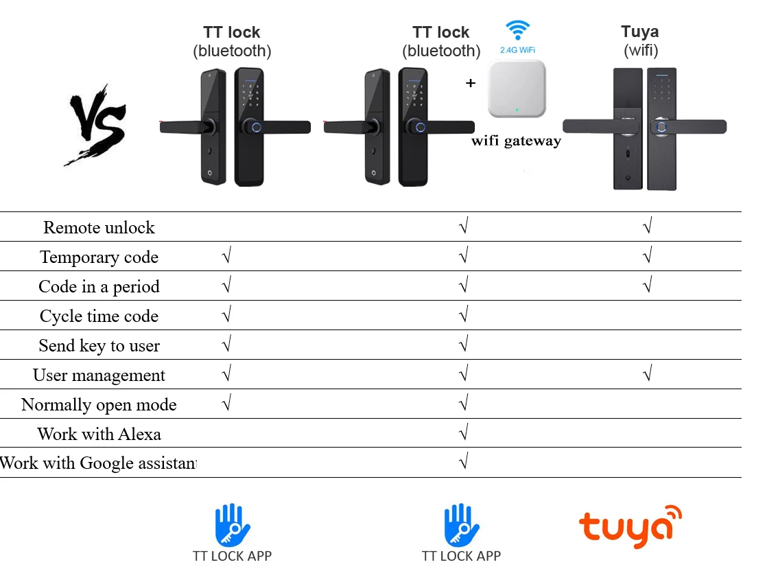 Примечание: Все батареи в замке и пульте дистанционного управления удалены.Примечание: для блокировки kit1 и kit2, чтобы убедиться, что вы можете использовать Alexa и Google home для управления блокировкой, сначала найдите TTLock в Alexa и ScienerSmart в Google home с вашего местоположения, чехол недоступен в некоторых местах. Для блокировки Kit3 tuya его можно управлять только через Wi-Fi, Не поддерживайте alexa или google home.Kit1: Поддержка блокировки ttlock (Bluetooth, не wifi)/отпечаток пальца/код/карта/ключKit2: замок + шлюз. Поддержка ttlock (Bluetooth и wifi)/отпечатков пальцев/кода/карты/ключа.Kit3: Блокировка поддерживает управление wifi tuya, возможность управления через wifi удаленно без ограничения расстояния. Шлюз не нужен. Не поддерживает alexa или шлюз.См. Изображение ниже для разницы между различными версиями