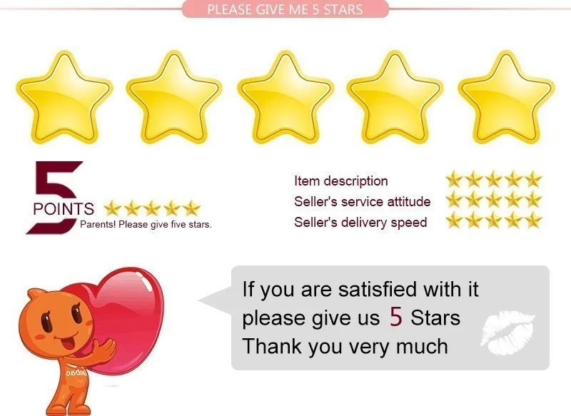 1. Пожалуйста, оставьте положительный отзывы в иСветильник 5 звездДля нас, если вы удовлетворены нашими товарами и услугами. Ваш отзыв важен для нас.