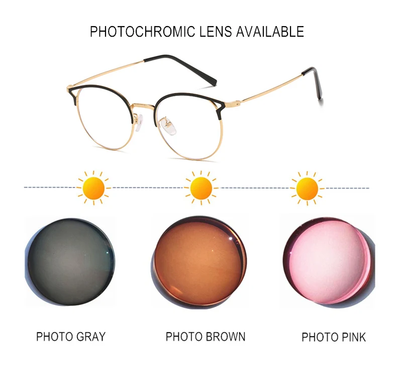 О фотохромные линзы, они будут прозрачными и бесцветными в помещении или в темных местах, но они изменят цвет на открытом воздухе или на солнце, чтобы защитить ваши глаза от сильного светильник.