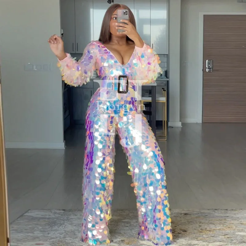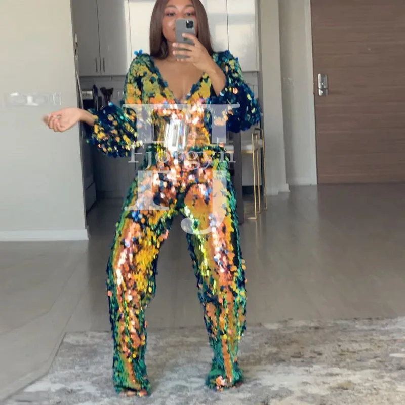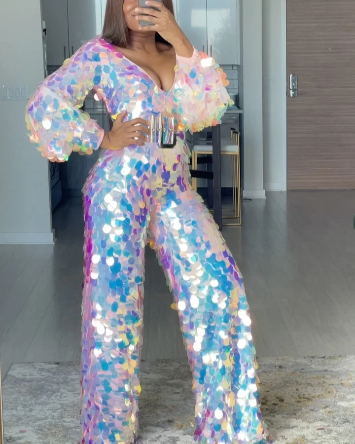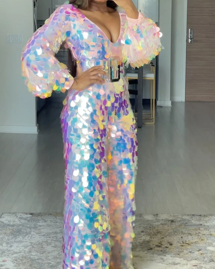 Женское вечернее платье, с V-образным вырезом и блестками, с длинным рукавом