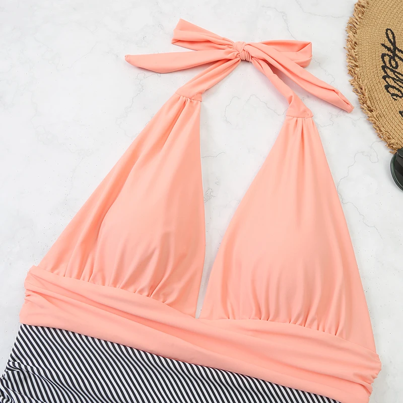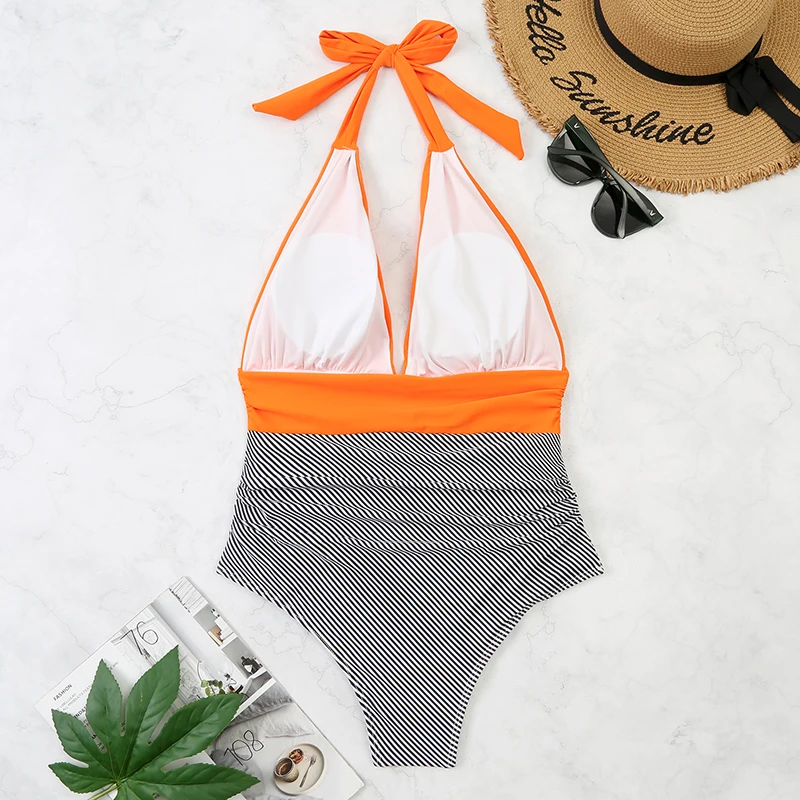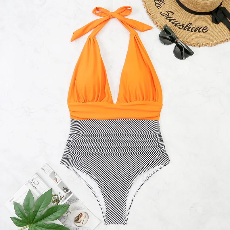 2022 сексуальный однотонный Цельный купальник, женский купальник с глубоким V-образным вырезом и лямкой на шее, Женский Монокини в полоску, Женское боди, пляжный купальный костюм