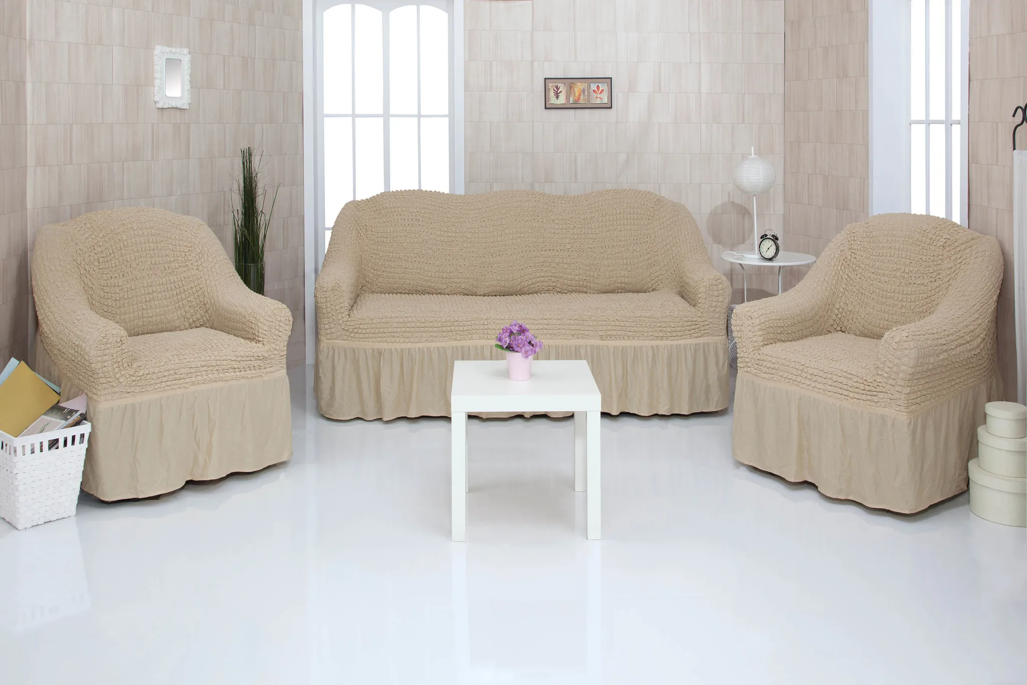 Состав комплекта: 1 чехол на 3-х местный диван + 2 чехла на креслаСостав ткани: 100% полиэстерЦвет: БежевыйСтирка: машинная, 30 градусовРазмеры кресел: длина от 50 до 90 см, высота до 90 см, глубина до 90 см.Размеры дивана: длина от 150 до 210 см, высота до 90 см, глубина до 90 см.