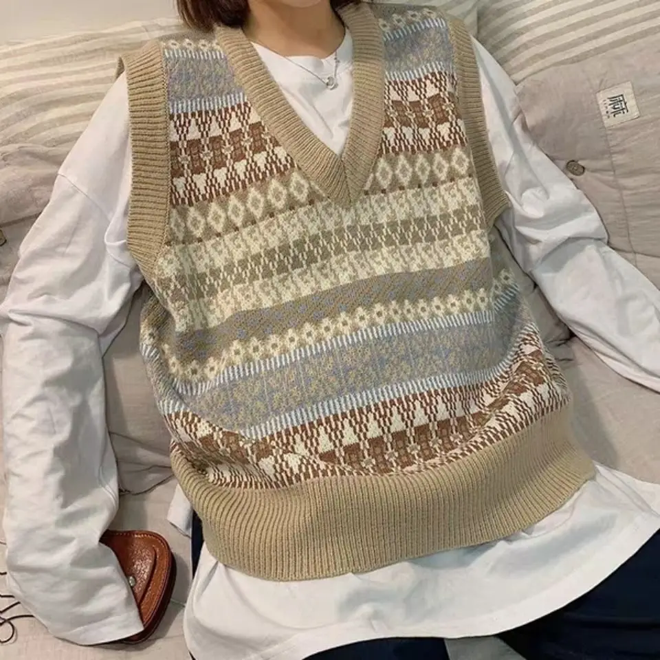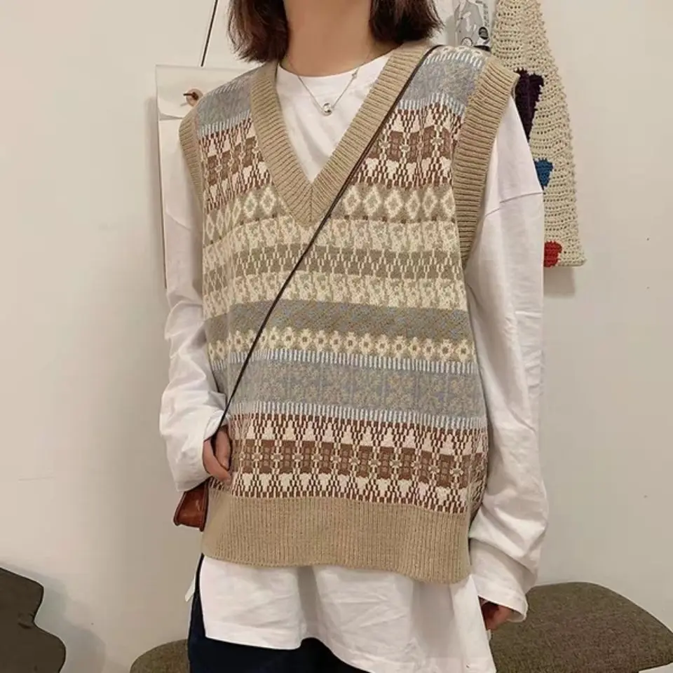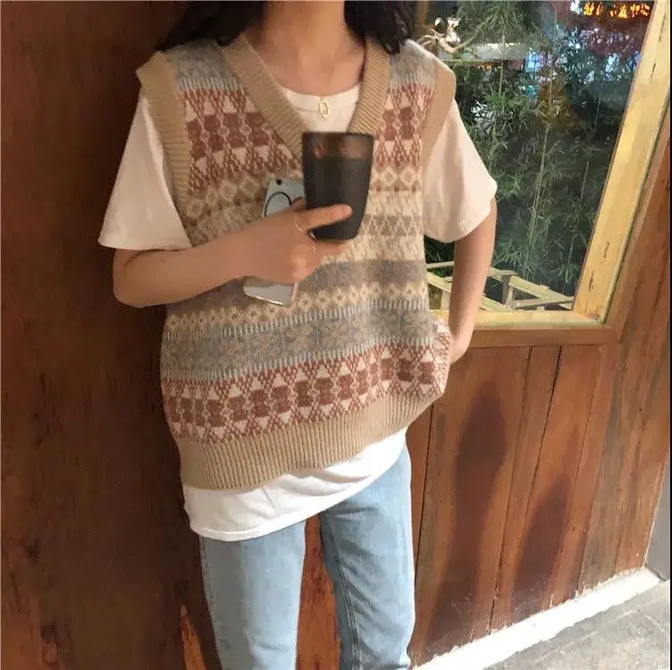★★★Параметры★★★ Материал: хлопок Толщина: обычная Рукав: нет Узор: геометрический Тип: свитер-жилет Стиль: Повседневный и свободный Тип шеи: v-образный вырез Сезон: весна, осень, зима Размер: S M L XL