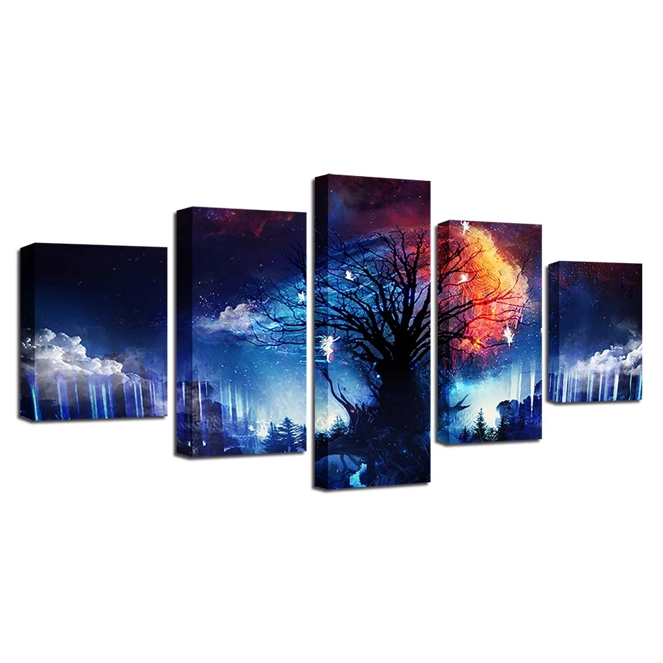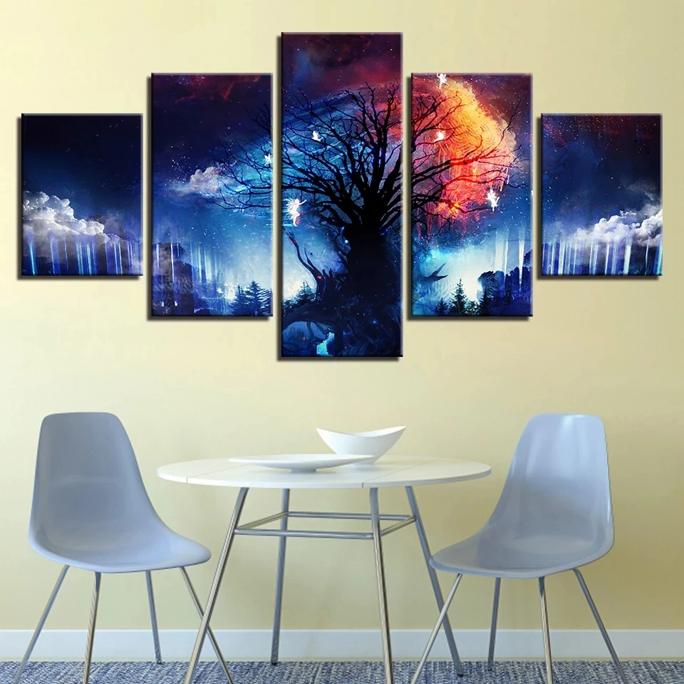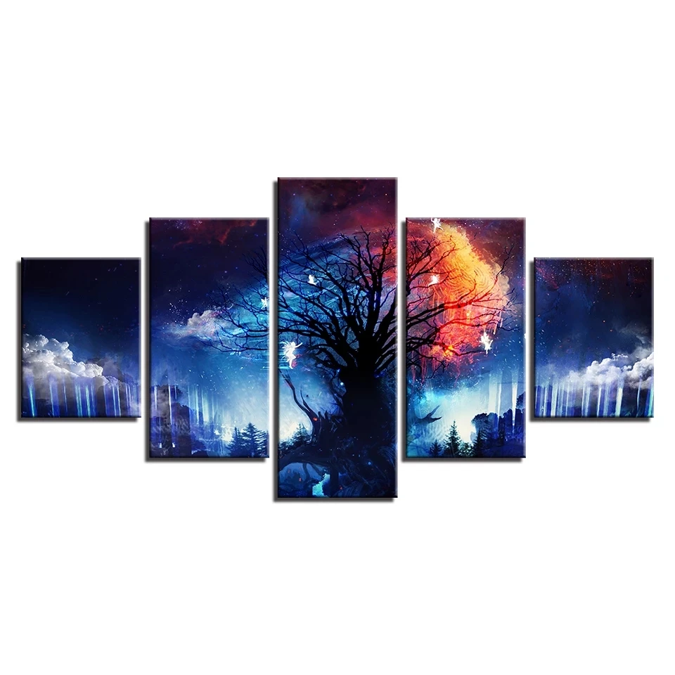Плакат на холсте с HD-печатью, модульные картины, 5 шт., дерево, облако, звездное небо, пейзаж, живопись, настенное искусство, домашний декор, рамка для гостиной