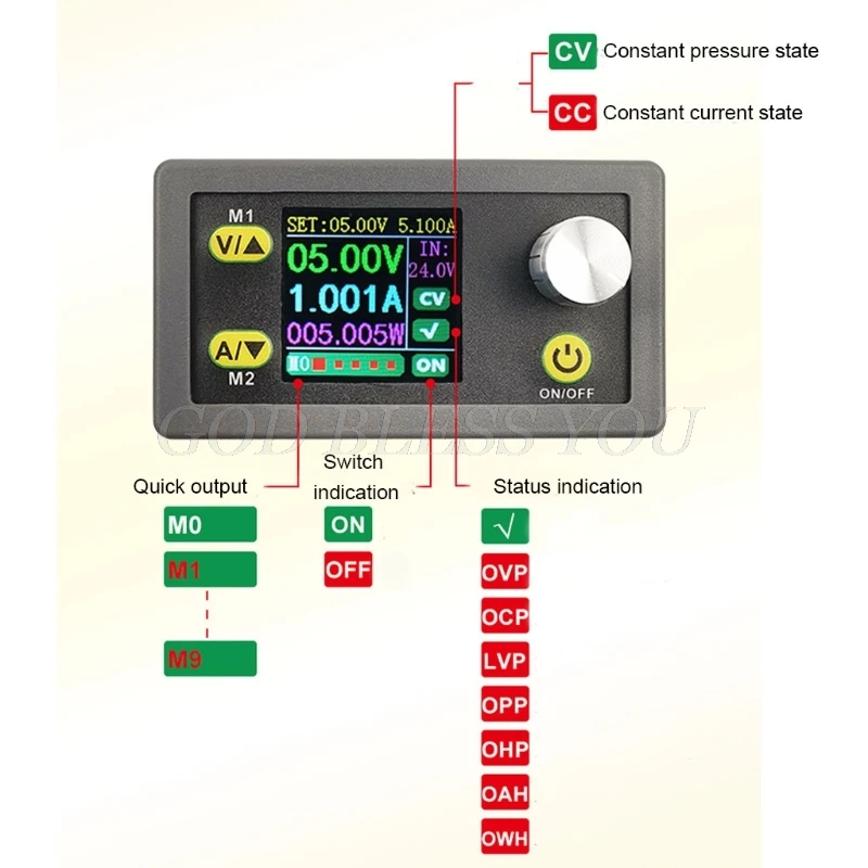 Модель: WZ3605EДисплей: цветной ЖК-дисплей 1,44 дюймаДиапазон входного напряжения: 6,00-36,00 вВход разрешение напряжения: 0,1 VДиапазон выходного напряжения: 0,60-36,00 вВыход разрешение напряжения: 0,01 V!Диапазон выходного тока: 0-5.000AРазрешение выходного тока: 0.001AДиапазон выходной мощности: 0-80,000 ВтТочность входного напряжения: +(1% + 5 слов)Точность выходного напряжения: +(0.3% + 3 слова)Точность выходного тока: +(0.5% + 5 слов)Типичное значение пульсации на выходе: 150 мВ пиковое-пиковое значение нормальный диапазон рабочих температур: -10 °C ~ 60 °C статистический диапазон времени: 10000 часовДиапазон измерения энергии: 0-99999.999WHДиапазон измерения емкости: 0-99999.999AHЭнергетическая Статистическая погрешность: + 2%Яркость экрана: 0-6 Всего 7 уровней