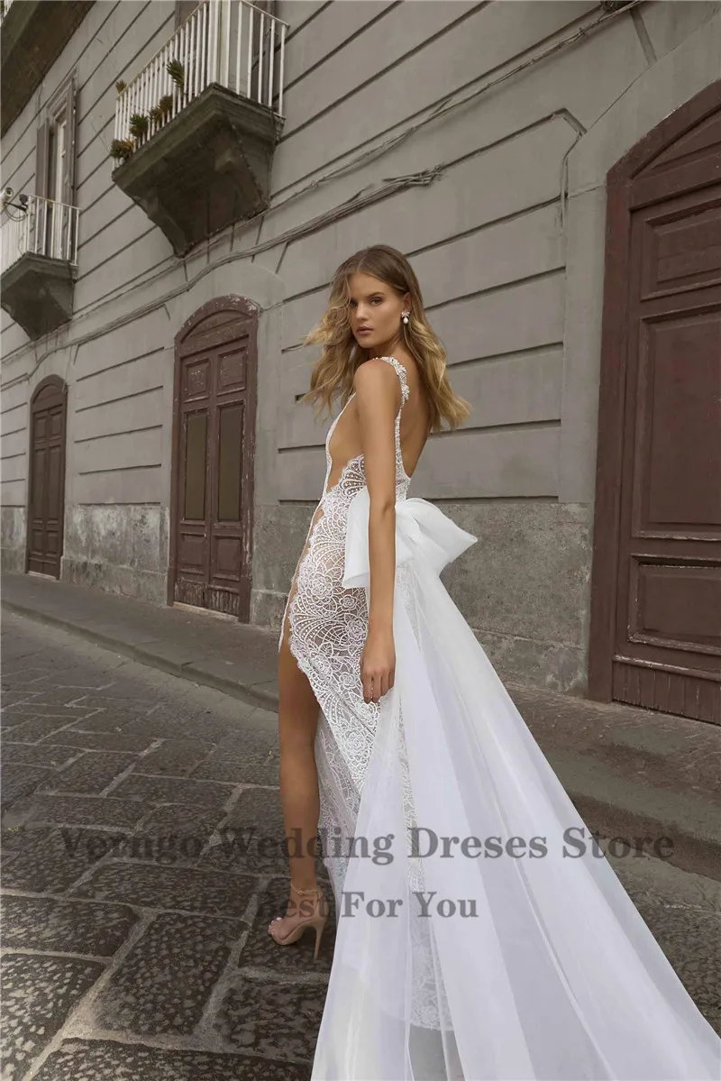 Современное кружевное пляжное свадебное платье Verngo со съемным нарукавником и бантом сзади с кристаллами на одно плечо с вырезом сексуальное свадебное платье