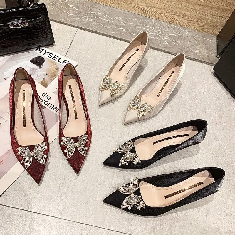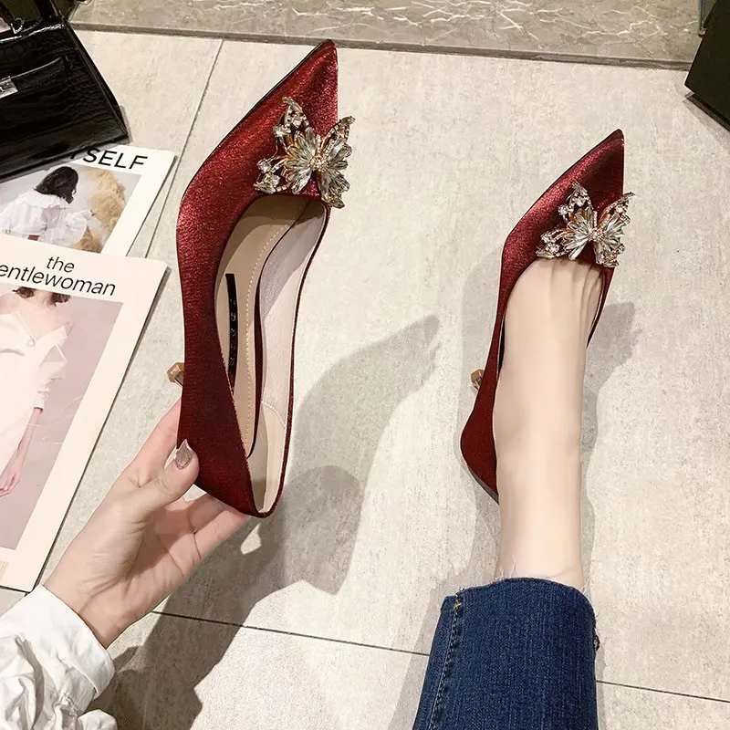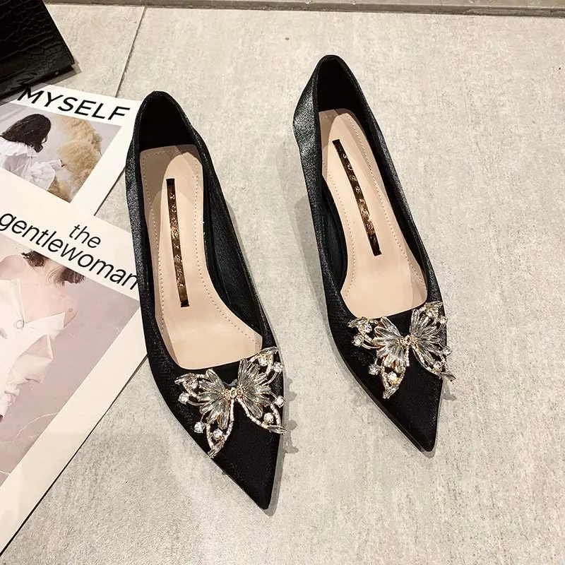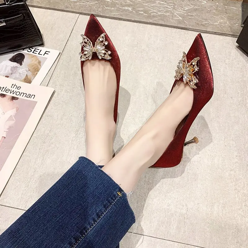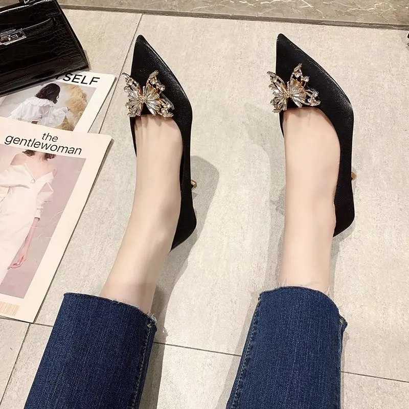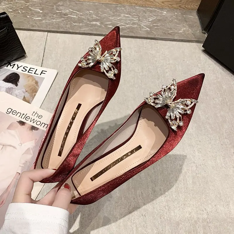 Дизайнерские свадебные туфли с украшением в виде кристаллов туфли на высоком каблуке "Бабочки", с острым носком, большой выбор расцветок; Обувь для деловой женщины на каблуках-Столбиках; Тонкая женская обувь на высоком каблуке