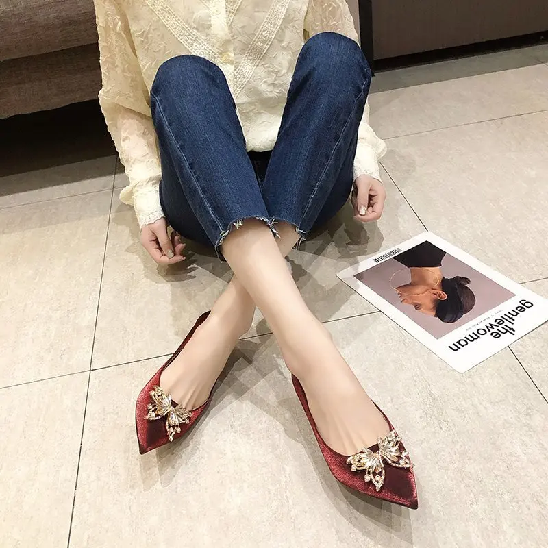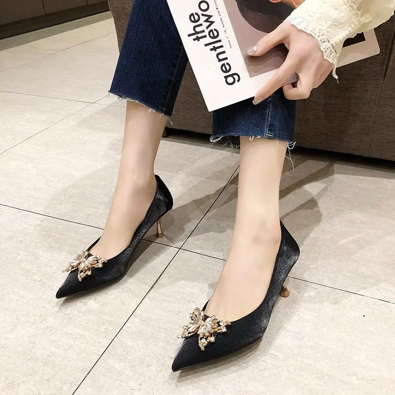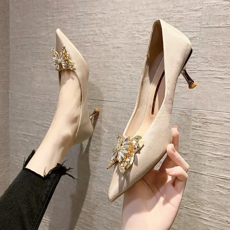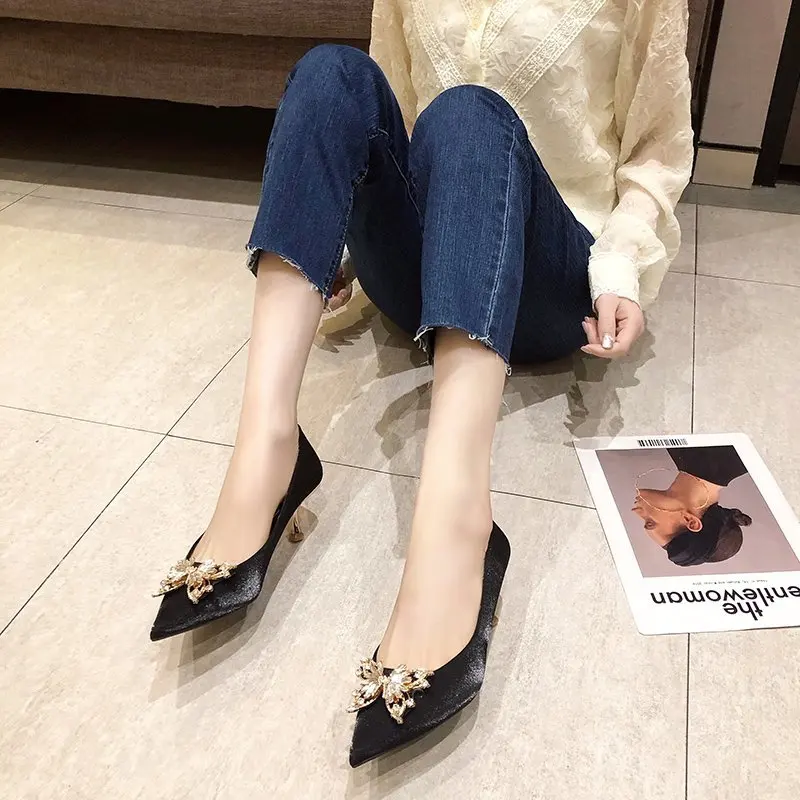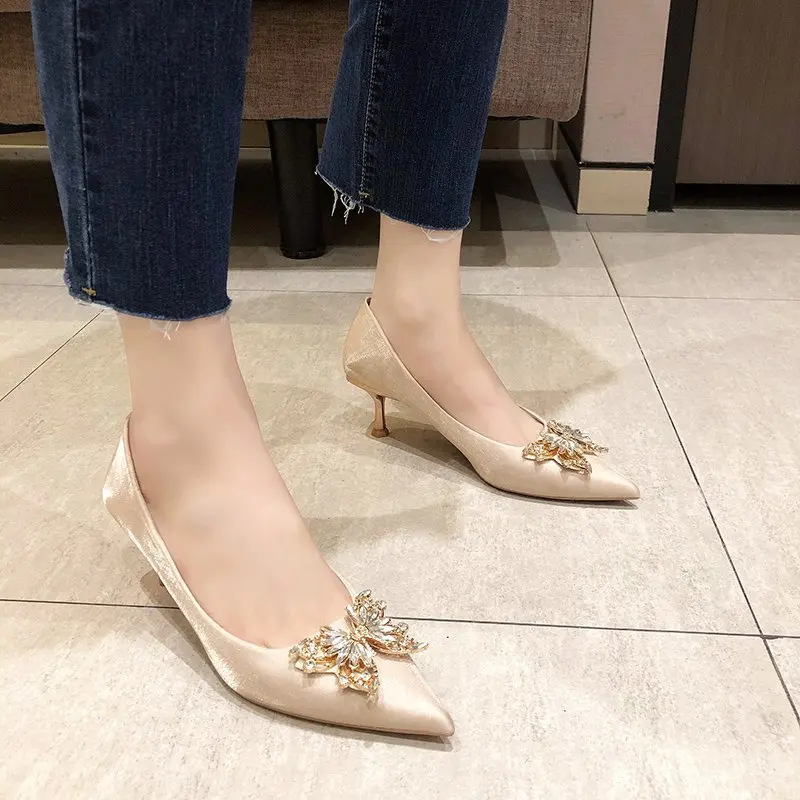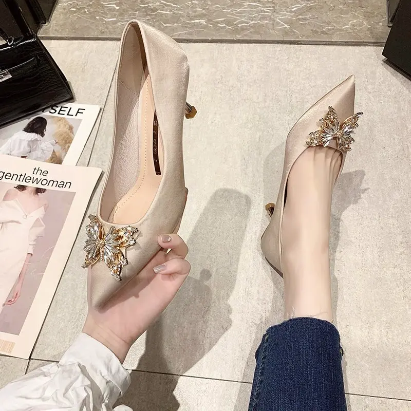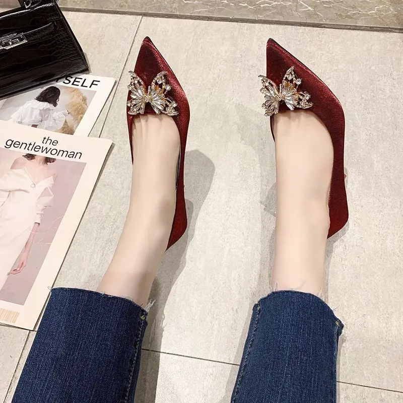 Дизайнерские свадебные туфли с украшением в виде кристаллов туфли на высоком каблуке "Бабочки", с острым носком, большой выбор расцветок; Обувь для деловой женщины на каблуках-Столбиках; Тонкая женская обувь на высоком каблуке