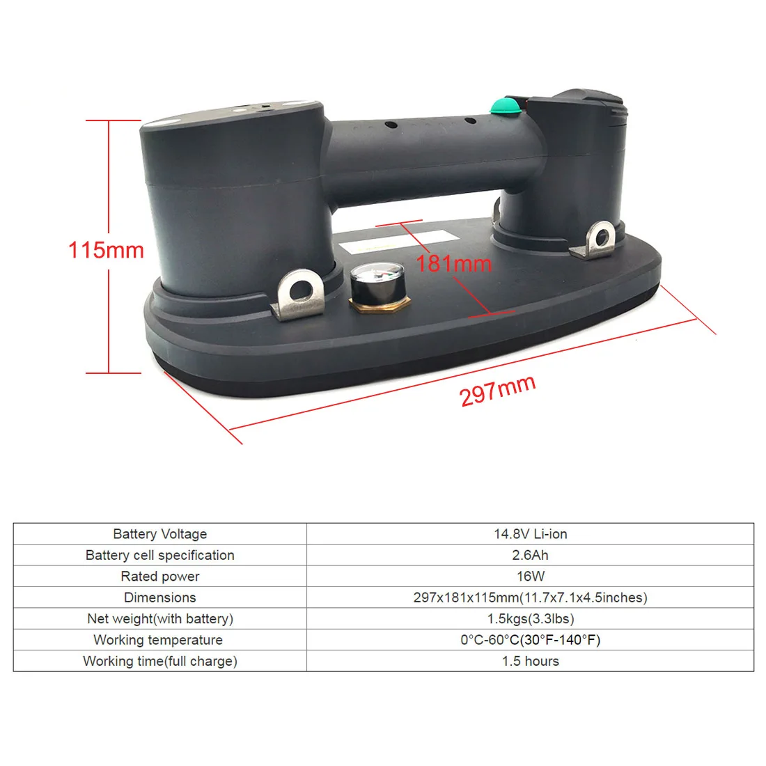 Номер модели: вакуумный стеклоподъемникМаксимальная подъемная нагрузка: 375 фунтов (170 кг)Напряжение батареи: 14,8 в li-ionБатарея сотовый Параметры: 2,6 АчНоминальная мощность: 16 ВтРазмеры: 297x181x115 мм (11,7x7,1x4,5 дюйм (ов)Вес нетто (с батареей): 1,5 кг (3.3lbs)Рабочая температура: -5 °C - 60 °C (23 °F - 140 °F)Время работы (полная зарядка): 1,5 часов