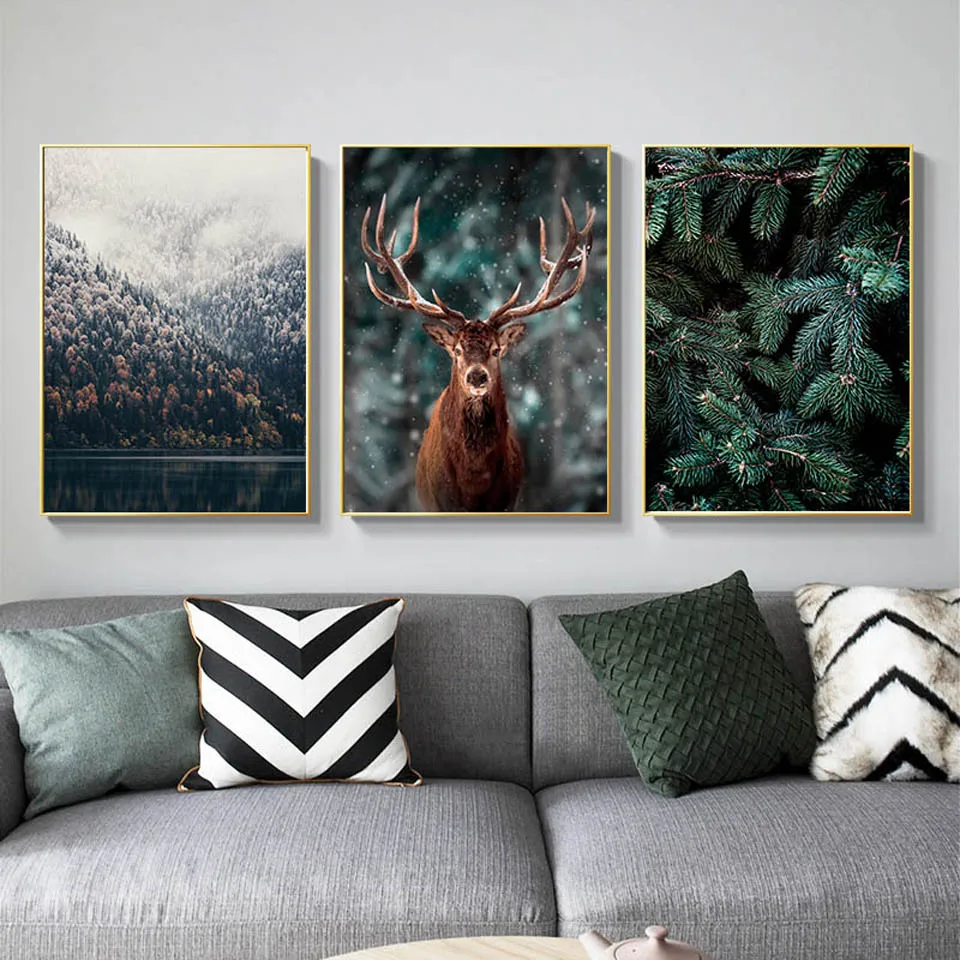 Скандинавский туман лес олень животное холст настенная живопись гор...