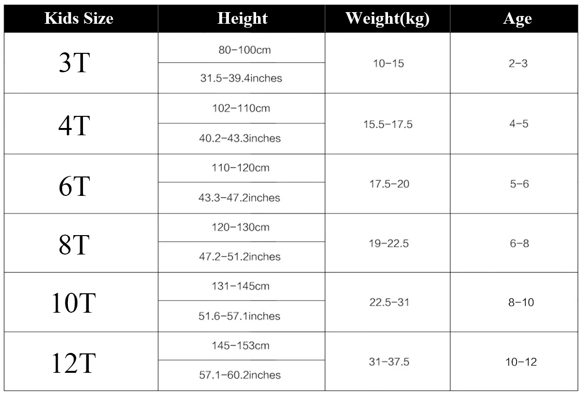 3Т: Рост: 80-100 см; Вес: 10-15 кг; Возраст: 2-3 года4Т: Рост: 101-110 см; Вес: 15,5-17,5 КГ; Возраст: 4-5 лет6т: Рост: 111-120 см; Вес: 17,5-20 кг; Возраст: 5-6 лет8Т: Рост: 121-130 см; Вес: 19-22,5 кг; Возраст: 6-8 лет10т: Рост: 131-145 см; Вес: 22,5-31 кг; Возраст: 8-10 лет12т: Рост: 145-160 см; Вес: 31-37,5 кг; Возраст: 10-12 лет