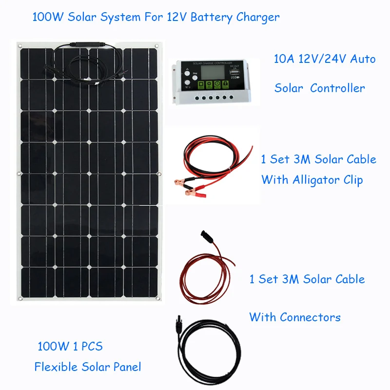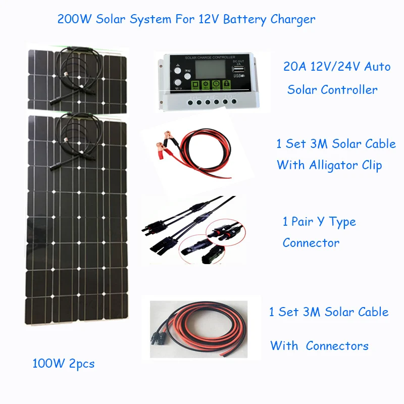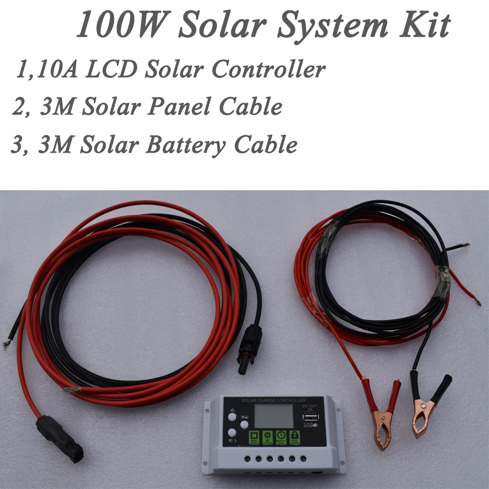 1. Эти комплекты солнечной системы мощностью 100 Вт или 200 Вт включают в себя 3 м кабель солнечной батареи для подключения солнечной панели к контроллеру солнечной зарядки 2, также 100 Вт или 200 Вт комплекты солнечной системы включают 3 м кабель батареи с аллигатором для подключения солнечного контроллера к батарее