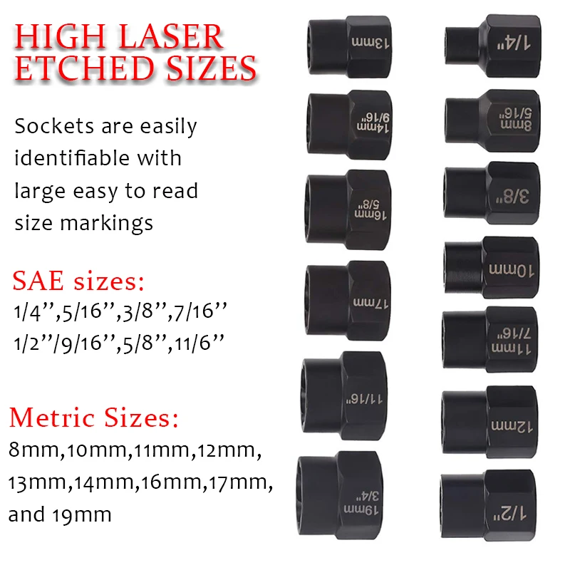 1. Подходит для большинства инструментов-с 3/8 "квадратным приводом для использования с ручными трещотками, гайковертами и воздушными трещотками; Шестигранные балетки для использования с плоский гаечный ключ,Плоскогубцы, регулируемый ключ, розетки.2. Изготовлен из хромированной ванадиевой стали 40Cr, которая прочнее, чем инструментальная сталь, обеспечивая более длительный срок службы и большую долговечность.3. 1/4 ", 5/16"(8 мм), 3/8 ", 10 мм, 7/16"(11 мм), 12 мм, 1/2 ", 13 мм, 9/16"(14 мм), 5/8 "(16 мм), 17 мм, 11/16", 3/4 "(19 мм). Может использоваться на SAE и метрических размерах.4. Подходит для всех типов крепежей.
