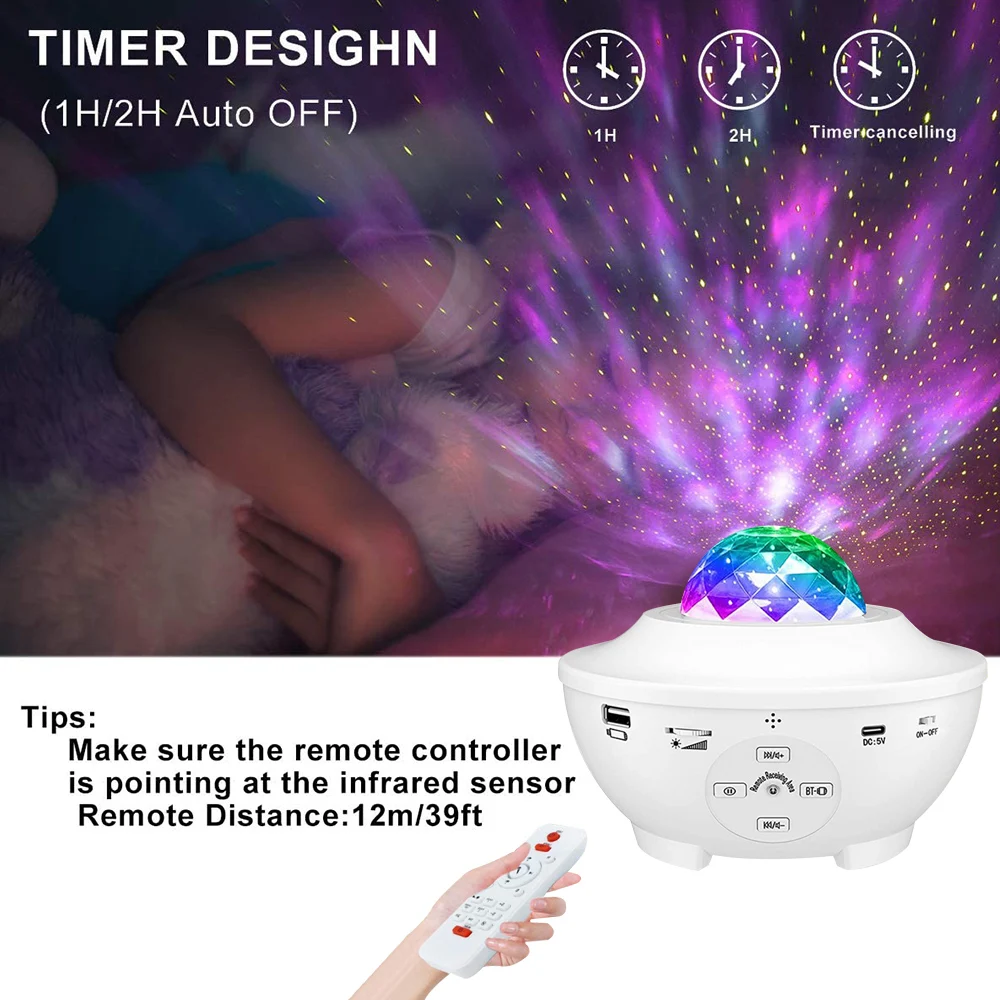 * Bluetooth-динамики и таймеры: вы можете выбрать любимую музыку через Bluetooth или USB. Высококачественная музыка и Звездные проекции Создают Романтическую и успокаивающую атмосферу ночью. Опция таймера более энергоэффективна, вы также можете бросить весь ночной светильник.