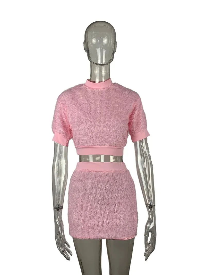 Новинка 2021, комплект из двух предметов, Женская плюшевая сумка, однотонная сексуальная одежда с коротким рукавом, облегающая одежда с круглым вырезом для ночного клуба и вечеринки