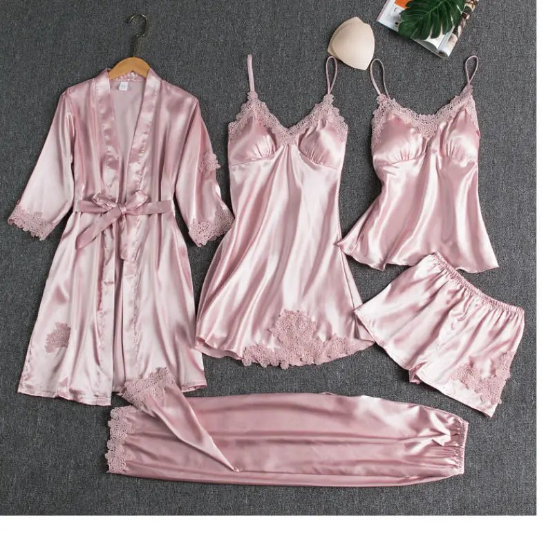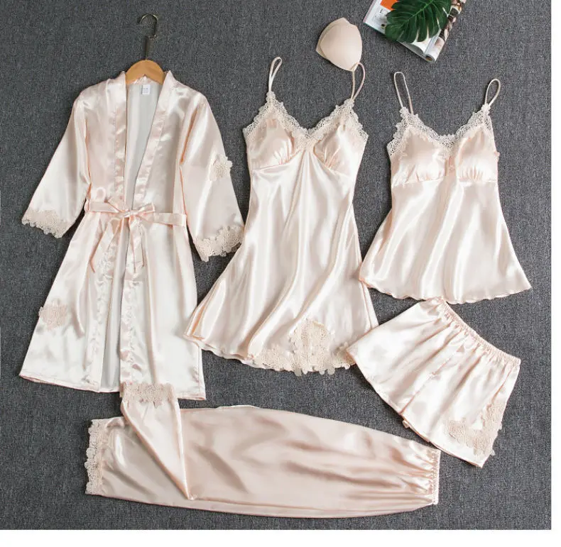 Пижама женская атласная, комплект из 5 предметов, кружевная ночная рубашка в стиле пэчворк для свадьбы, вискозный домашний костюм