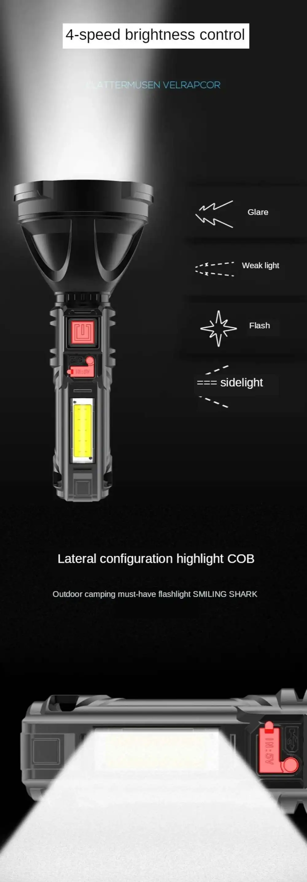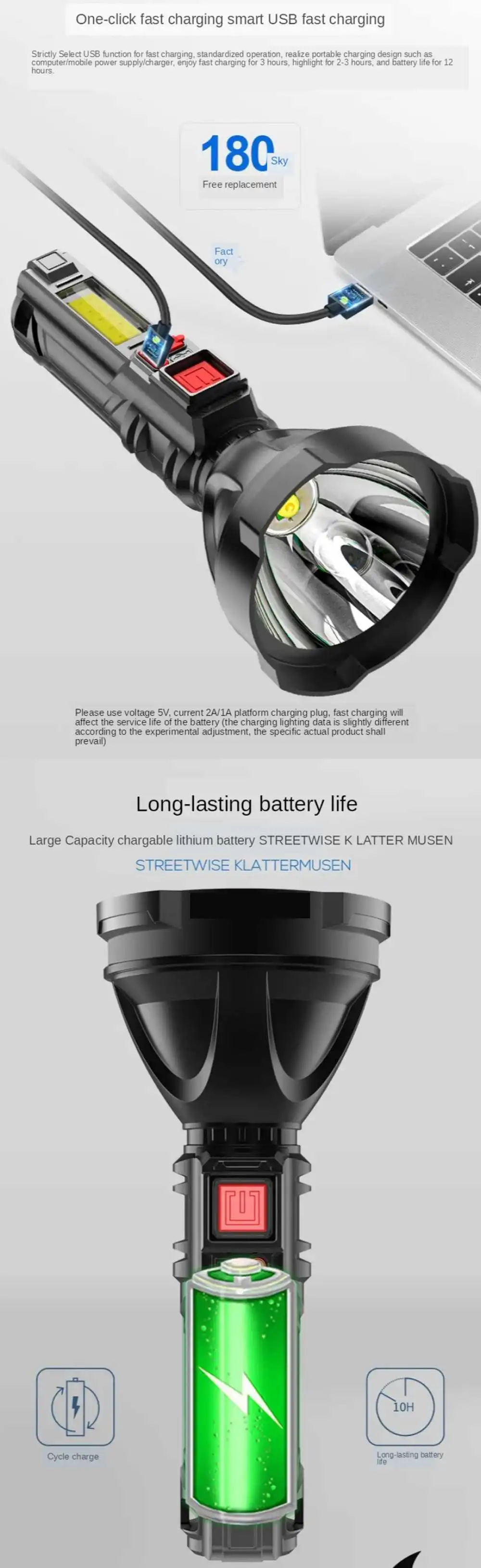 Боковой светильник: сильный светильникБатарея: 18650 перезаряжаемая литиевая батарея (встроенный)Тип зарядки: USB зарядка