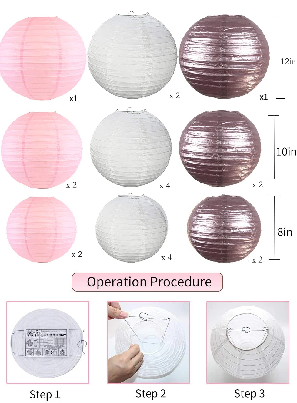 Упаковка: 1 шт фонарь с расширителем и инструкцией бумаги в ПП пакете; 20 шт бумажных фонарей в партии. 12 дюймов (30 см)- 1 розовое золото, 1 светло-розовый, 2 белый. 10 дюймов (25 см)- 2 цвета розового золота. 2 светло-розовые, 4 whte. 8 дюймов (20 см) - 2 цвета розового золота. 2 светло-розовые, 4 whte.